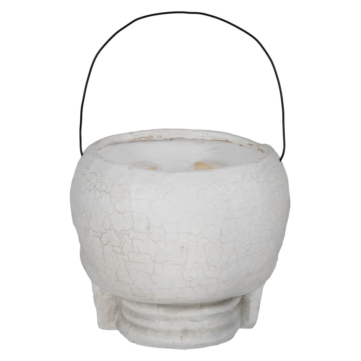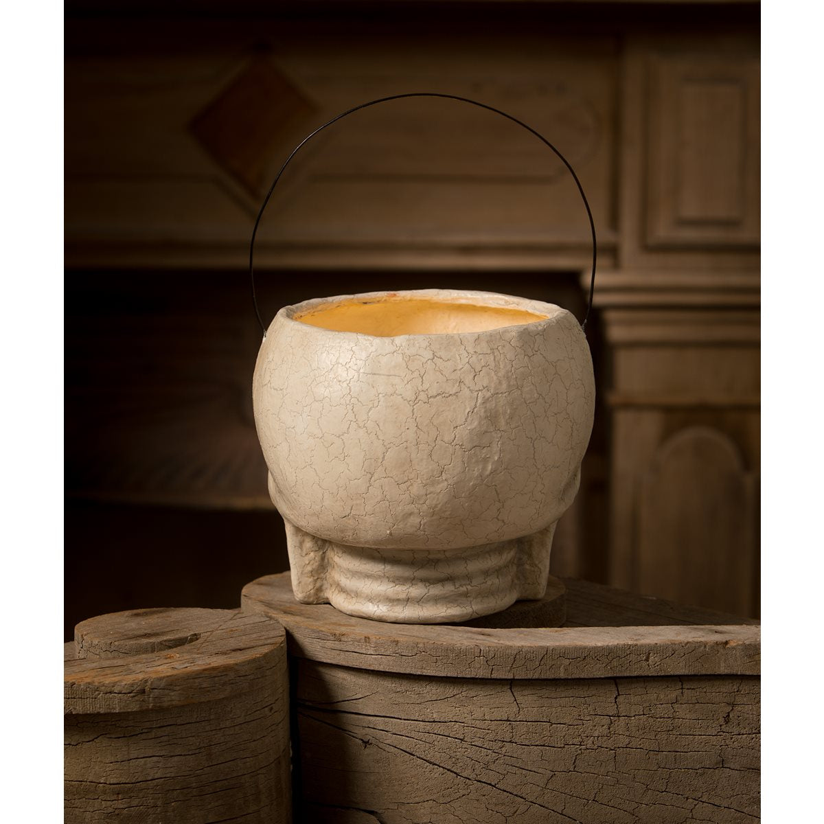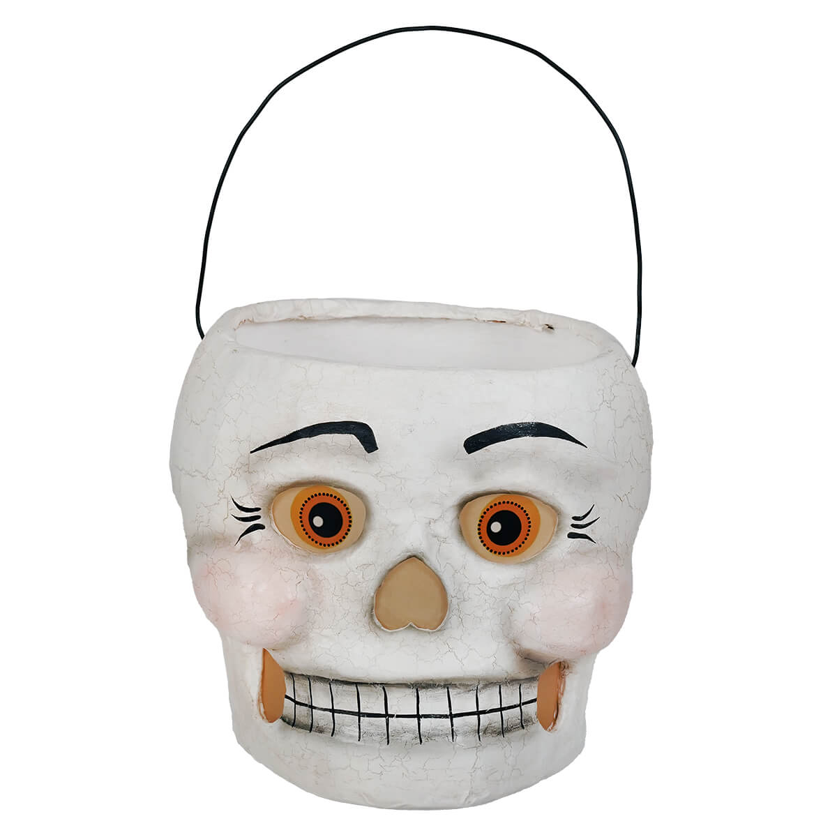 Oh, my cackling cauldrons! Behold the Silly Skelly Bucket, a bone-chilling delight for Halloween! This spine-tingling creation, designed by the talented witchy hands of Bethany Lowe, is a bewitching addition to your spooky festivities. Crafted from paper mache, vellum, and wire, this skull-shaped bucket measures a ghastly 8x9 inches.