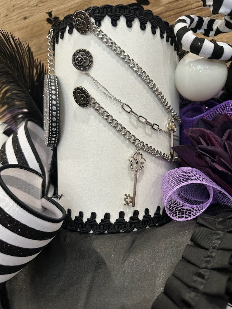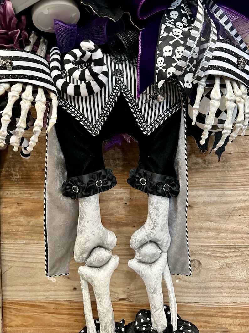 This gorgeous Skeleton Halloween wreath is definitely a showstopper! Featuring a hand-sewn, hand-painted skeleton body, legs, shoes and hat. Mr. Skelly (Petals and Plumes Members Only design) handmade by me. He is holding a battery-operated lantern in his right hand. Lots of embellishments, trim, and beautiful accents, high quality ribbon, black, white and checker ornaments scattered about the wreath. All of this is designed on a 24” pine base wreath, and accented with purple and black deco mesh, black plastic eucalyptus sprays and purple florals with eyeballs.