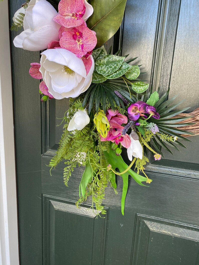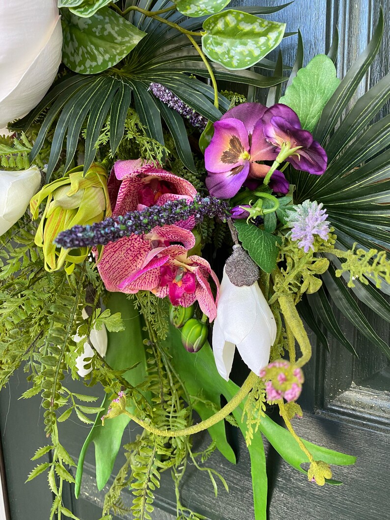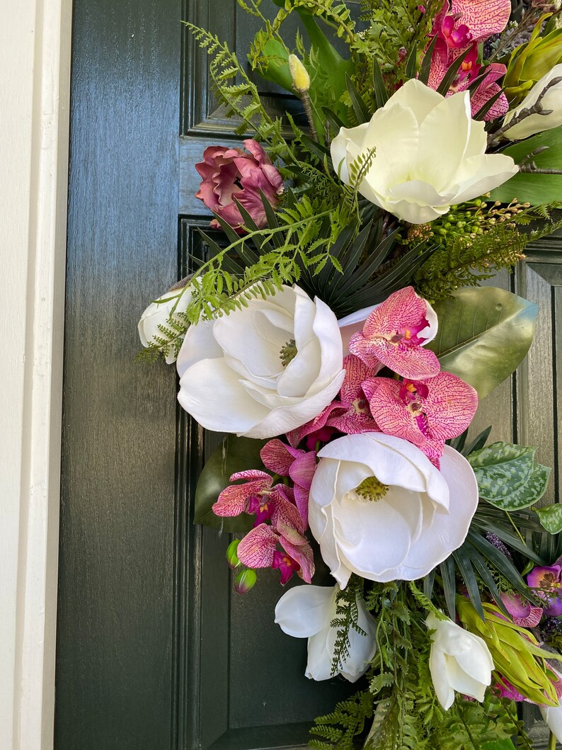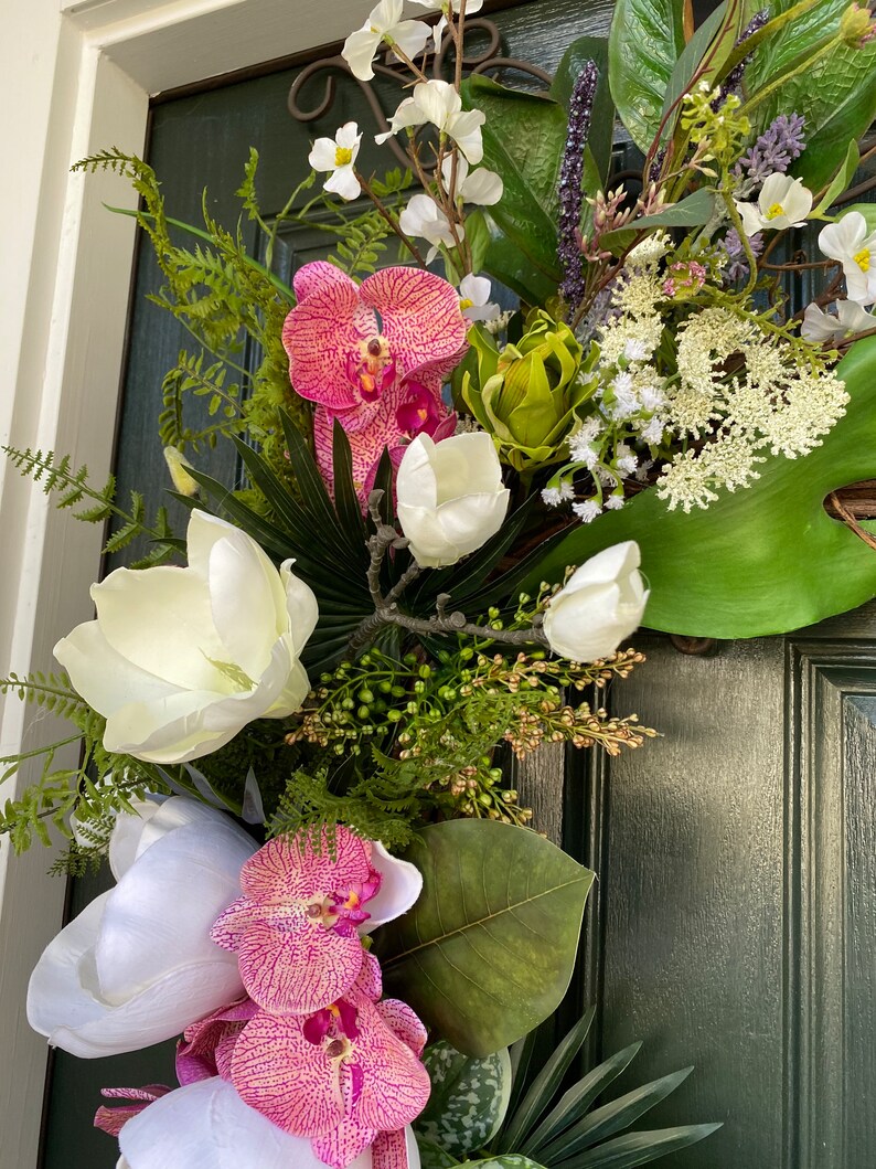OOH WOW!! I love this magnificent wreath . It is so elegant! What an eye catcher!! Large magnolias feel like you just picked them and don’t forget the orchids! Yes orchids!! They are so real! All flowers are of the best quality and it shows in the brilliant colors as well as touch. This wreath will look stunning inside your home or outside . It is a statement piece all by itself. Beautiful and thoughtful Mother’s Day gift. XL. 38” height. 29” width 12”depth