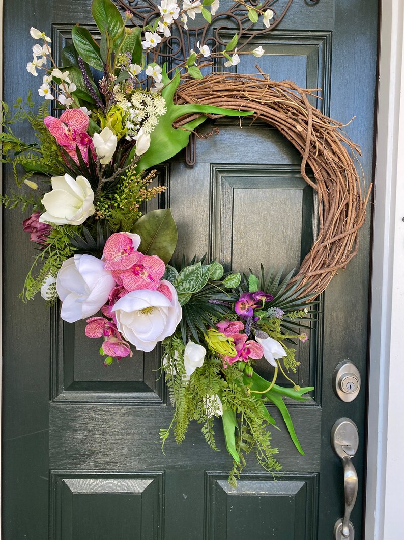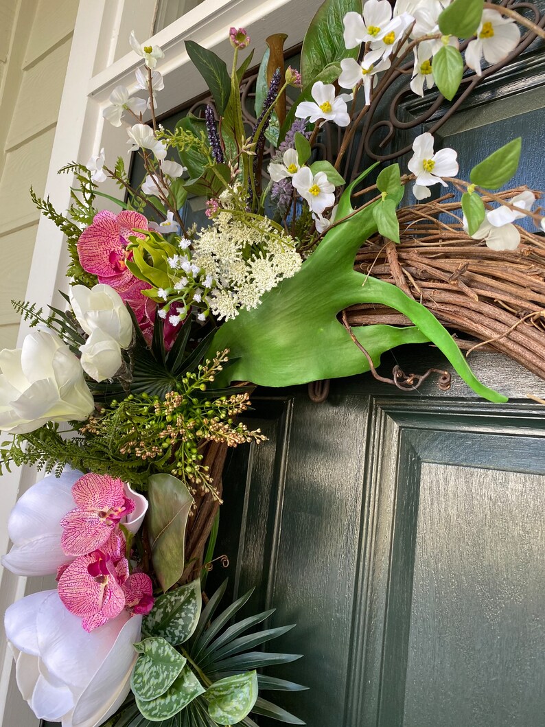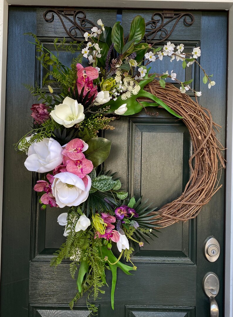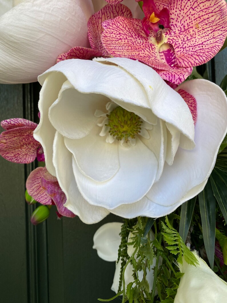 OOH WOW!! I love this magnificent wreath . It is so elegant! What an eye catcher!! Large magnolias feel like you just picked them and don’t forget the orchids! Yes orchids!! They are so real! All flowers are of the best quality and it shows in the brilliant colors as well as touch. This wreath will look stunning inside your home or outside . It is a statement piece all by itself. Beautiful and thoughtful Mother’s Day gift. XL. 38” height. 29” width 12”depth