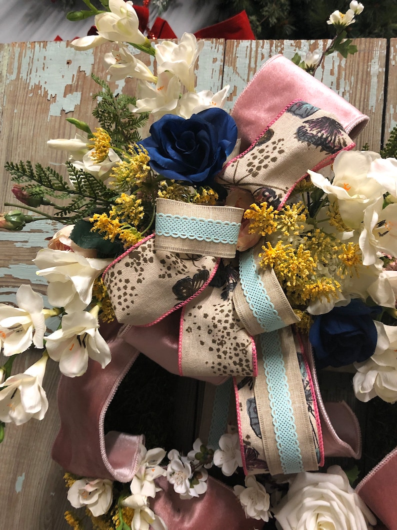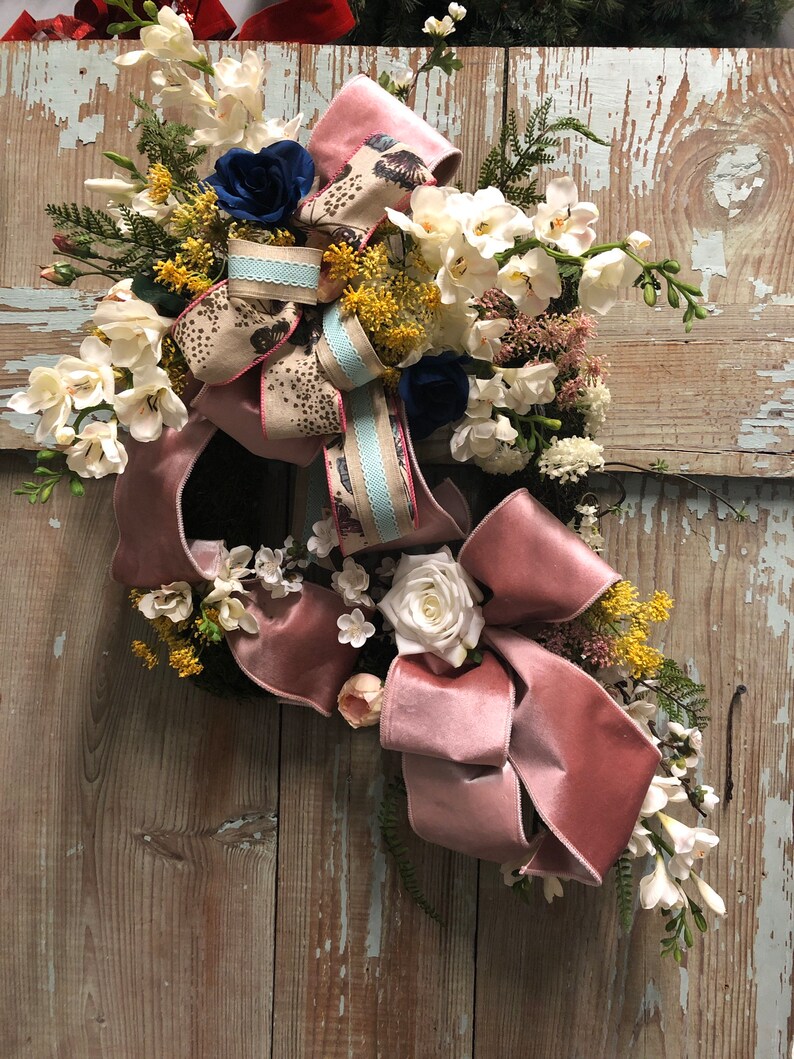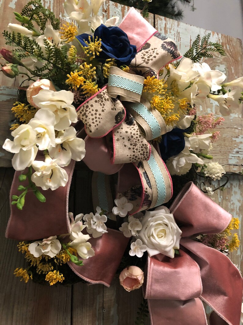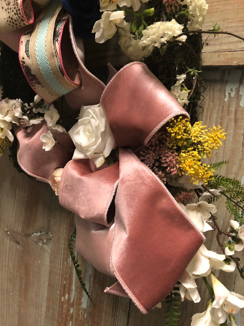 Beautiful wreath with so many gorgeous flowers. Roses of all colors! The soft colors are reflected in the wide pink velvet ribbon. What a great gift for Mom. This wreath really makes a statement. It is classy but beautiful.