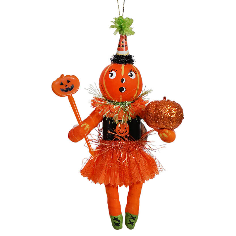 One thing you'll always discover about Pamela Plant's hand made, spun cotton designs is that they are full of fun details and made with care. The pumpkin girl is ready for Halloween, her favorite time of the year. She looks adorable in her festive party costume. This American made, handcrafted Spun Cotton Pumpkin Girl Ornament features vintage Halloween styling and is made using spun cotton, crepe paper and chenille.. Spun cotton is a vintage, Victorian way of making ornaments, where the spun cotton is applied over wire and then hand dyed, this one has a spun cotton head instead of the usual paper scrap image. Add some Victorian style festivity to your Halloween tree with this ornament. For an even more charming Halloween display on your feather tree, pair her with the Spun Cotton Pumpkin Boy Ornament!