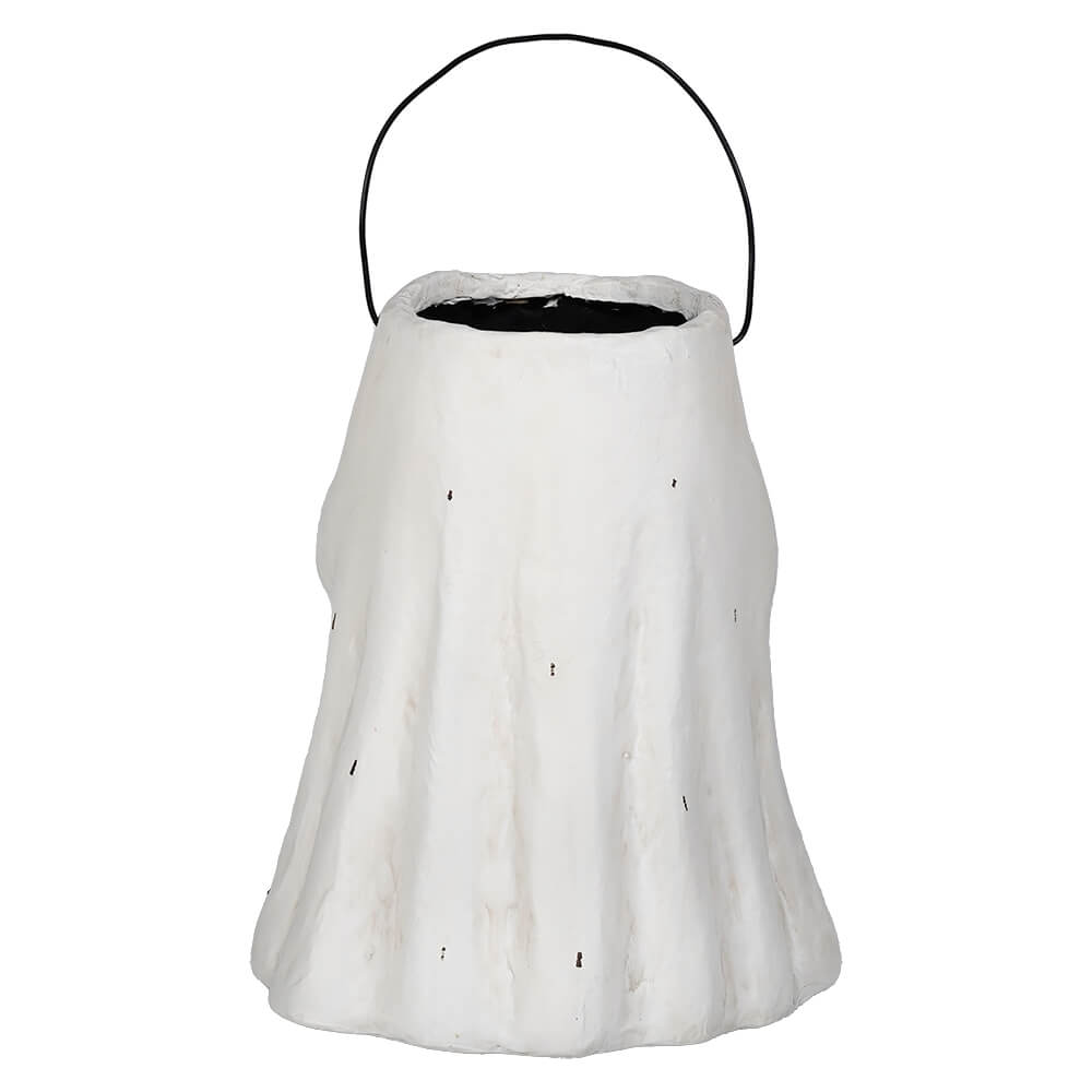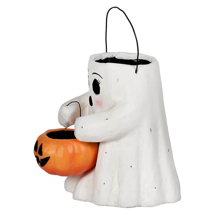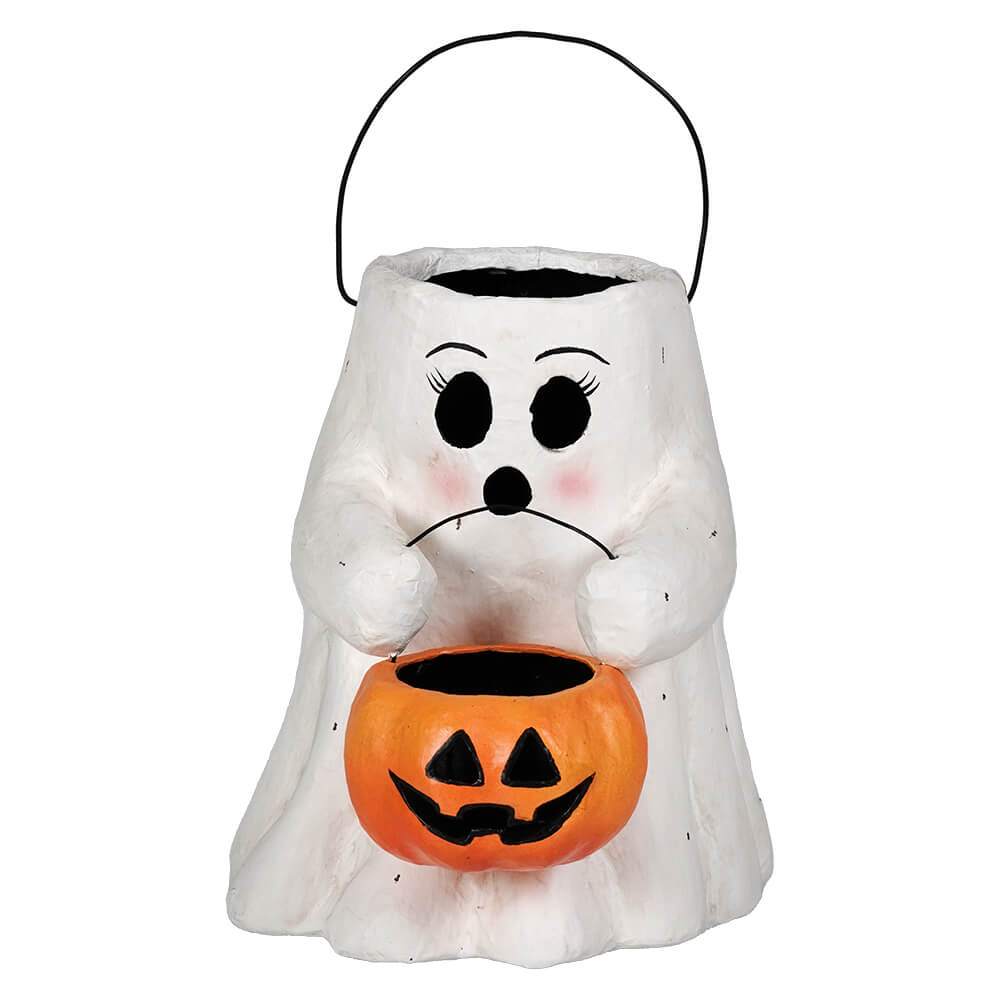 Crafted with care, this paper mache ghost captures the essence of classic Halloween style. Sweet Boo is accompanied by a snugly held Jack O' Lantern bucket, forming an irresistible duo. Watch as this petite pumpkin bucket comes alive when you put a battery-operated tea light placed inside. The warm and enchanting radiance adds an extra layer of magic to your Halloween ambiance, creating a captivating atmosphere.