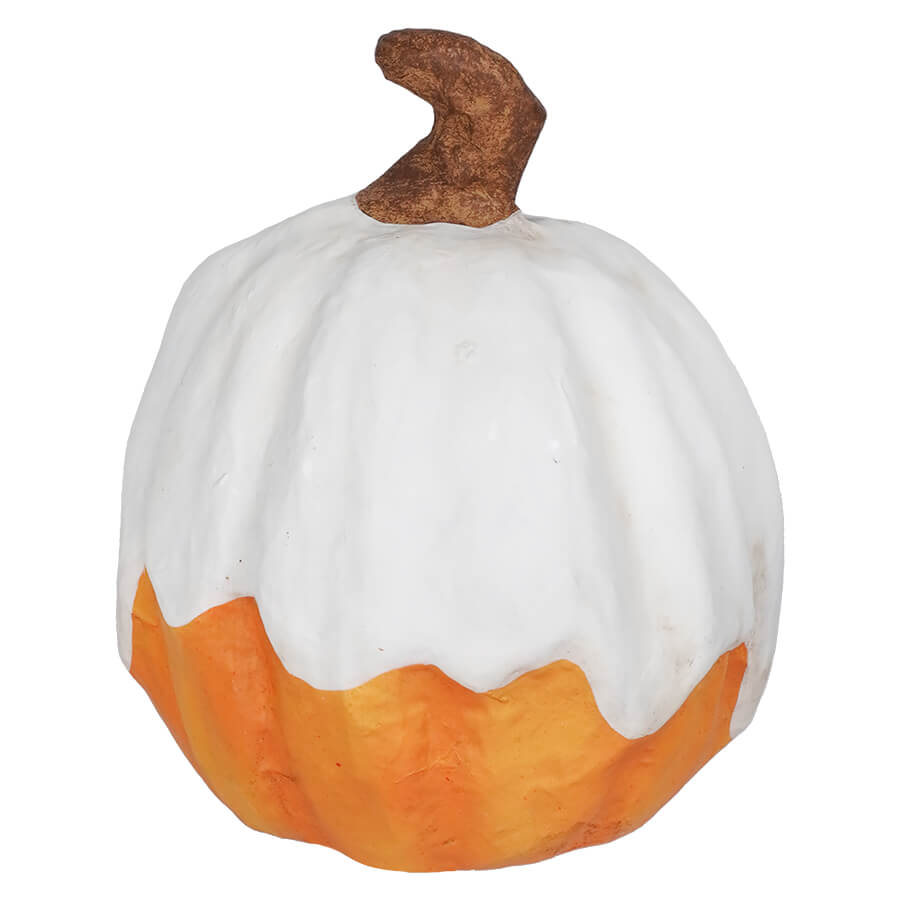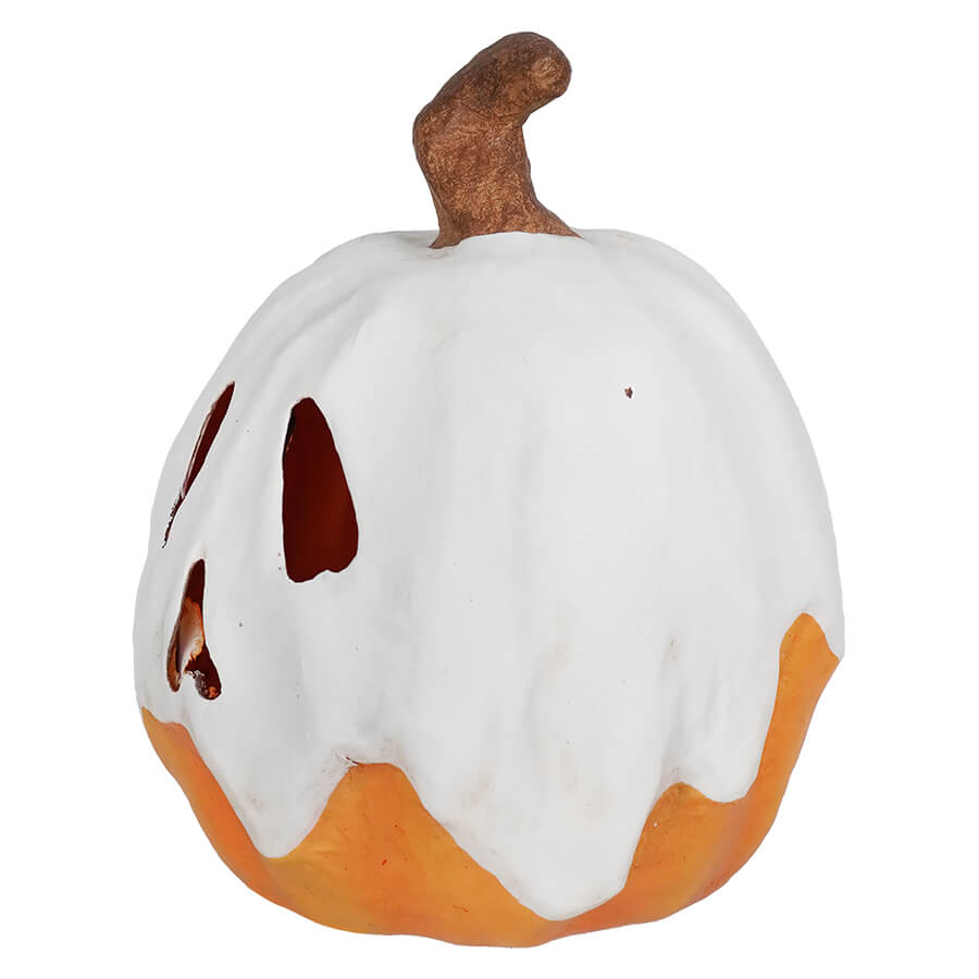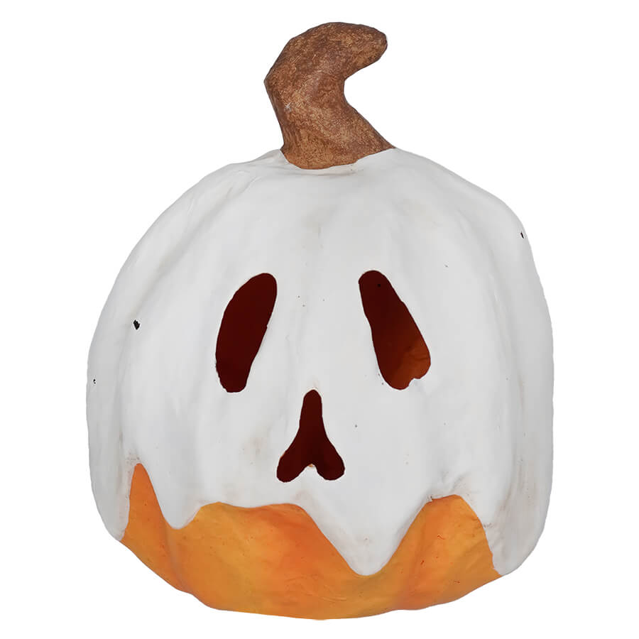 On a mystical Halloween eve, drippy and dreary, the Tall Ghost Jack Luminary crept out from the shadows, casting an ethereal spell upon all who encountered its spectral presence. With a flickering glow that danced within, it illuminated the path for trick-or-treaters, guiding them through the night in search of Halloween treasures. Looking like a jack o’ lantern coated in a layer of white wax....wax that appears to be oozing down the orange pumpkin, this luminary looks like a mischievous ghostly apparition. A convenient hole at the base allows for the placement of an electric tea light, to cast an enchanting glow that brings the ghostly face to life. This luminary adds an aura of mystery and charm to any Halloween display, making it a perfect accent for mantels, entryways, or tabletops. Bethany Lowe has created an enchanting ensemble of these ghost jack luminaries, so by combining the Tall Ghost Jack Luminary with the other Ghost Jack Luminaries, you will conjure a hauntingly delightful scene that captivates the imagination.