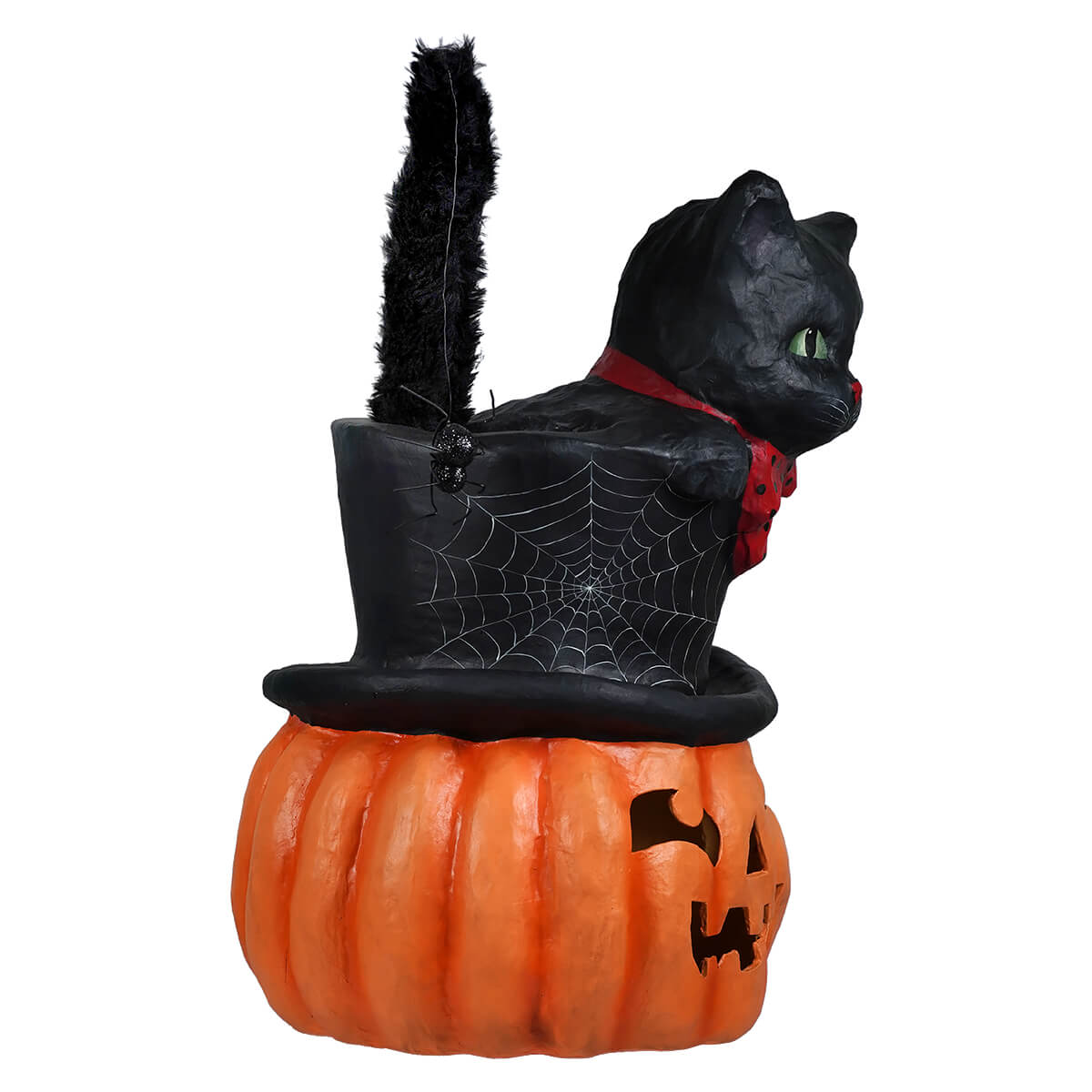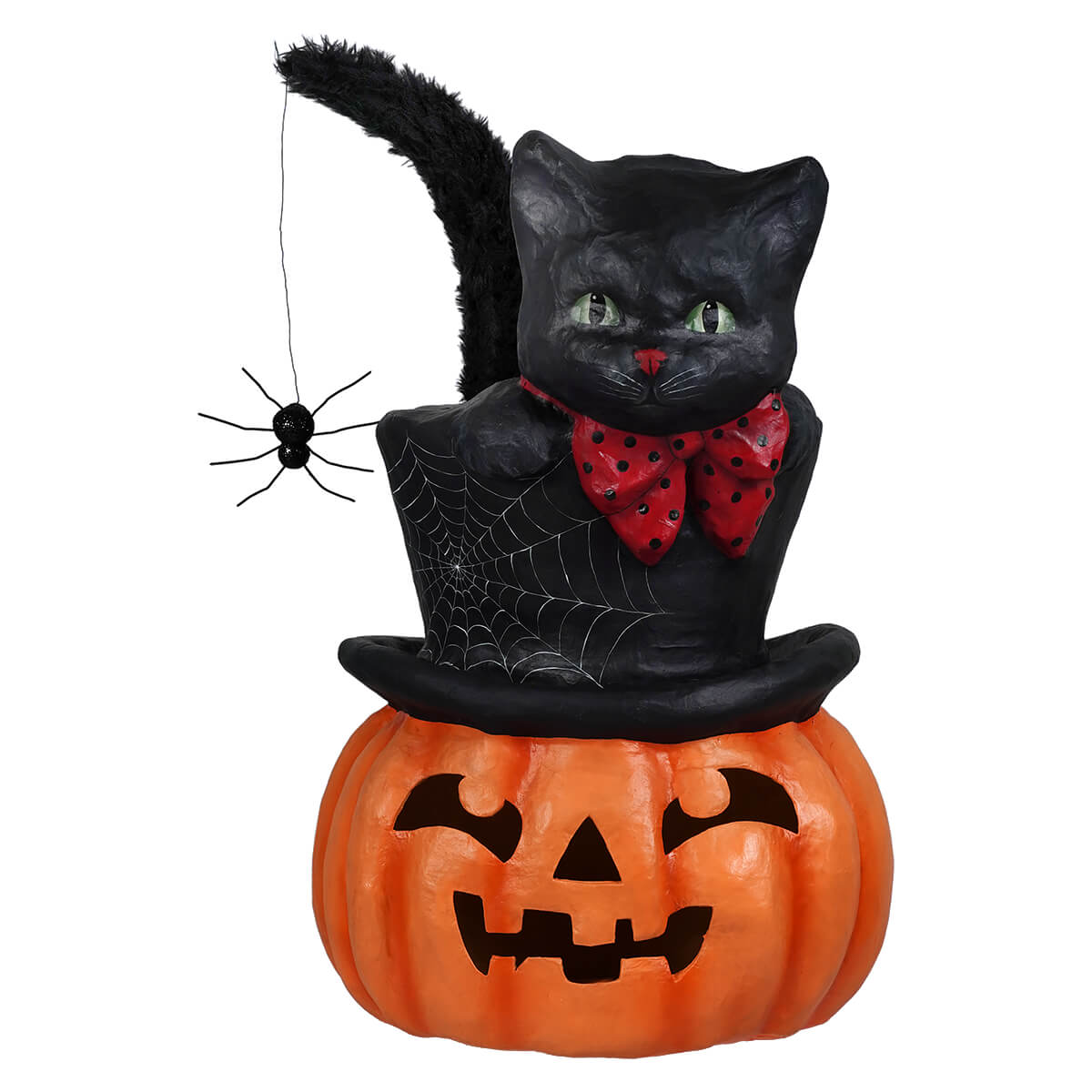 At the center of this magical scene is a grinning jack-o-lantern, carved in intricate detail, ready to spread the spirit of Halloween. What sets this Jack O'Lantern apart is his stylish accessory—a top hat that adds an extra touch of spirited fun because perched atop the hat is an adorable black cat, playfully peeking out of the hat, hoping a little attention comes his way! But that's not all! Hanging down from the cat's expressive, straight up in the air tail is a big black spider! EEK! It is suspended in mid-air, creating a playful but spidey dynamic that catches the eye. The cat himself dons a red bowtie with black polka dots, enhancing his dapper appearance.