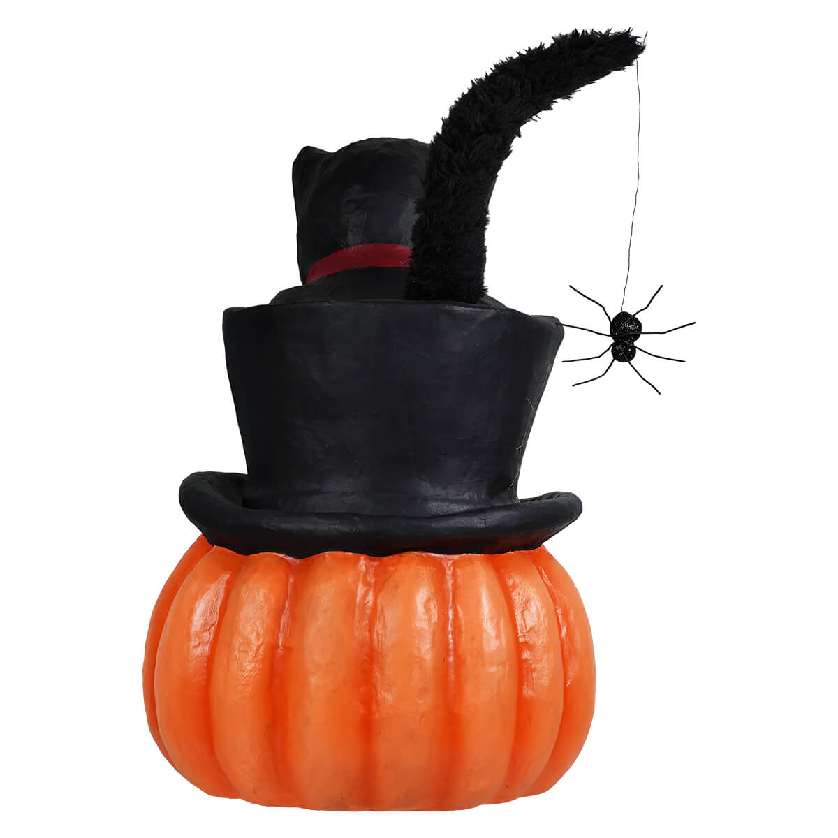 Measuring 20x12 inches, this Top Hat Surprise Jack O'Lantern is the perfect addition to your Halloween decor. Do you want to illuminate the smiling Jack o' Lantern's face?? It can be easily done by placing a battery operated candle in the bottom opening, it will add charm and warmth to this large paper mache piece. Whether as a centerpiece or as part of your overall decorations, this pumpkin party will bring a touch of magic and delight to any space. Embrace the magic of Halloween with this captivating piece and let it become a cherished part of your festive celebrations.