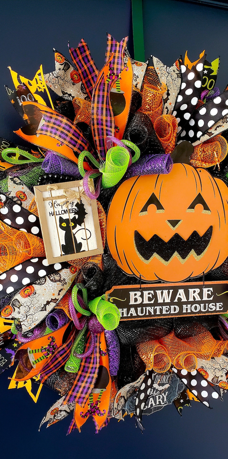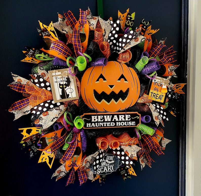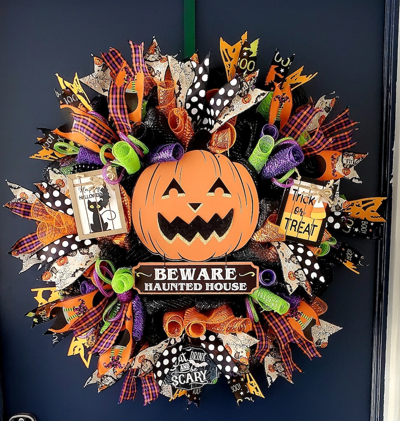Get ready to impress neighbors, friends, and trick or treaters this Halloween. This wreath is guaranteed to make you the envy of the neighborhood. It is full of texture. It is made a variety of mesh and fun Halloween ribbon in a variety of colors, patterns and textures.