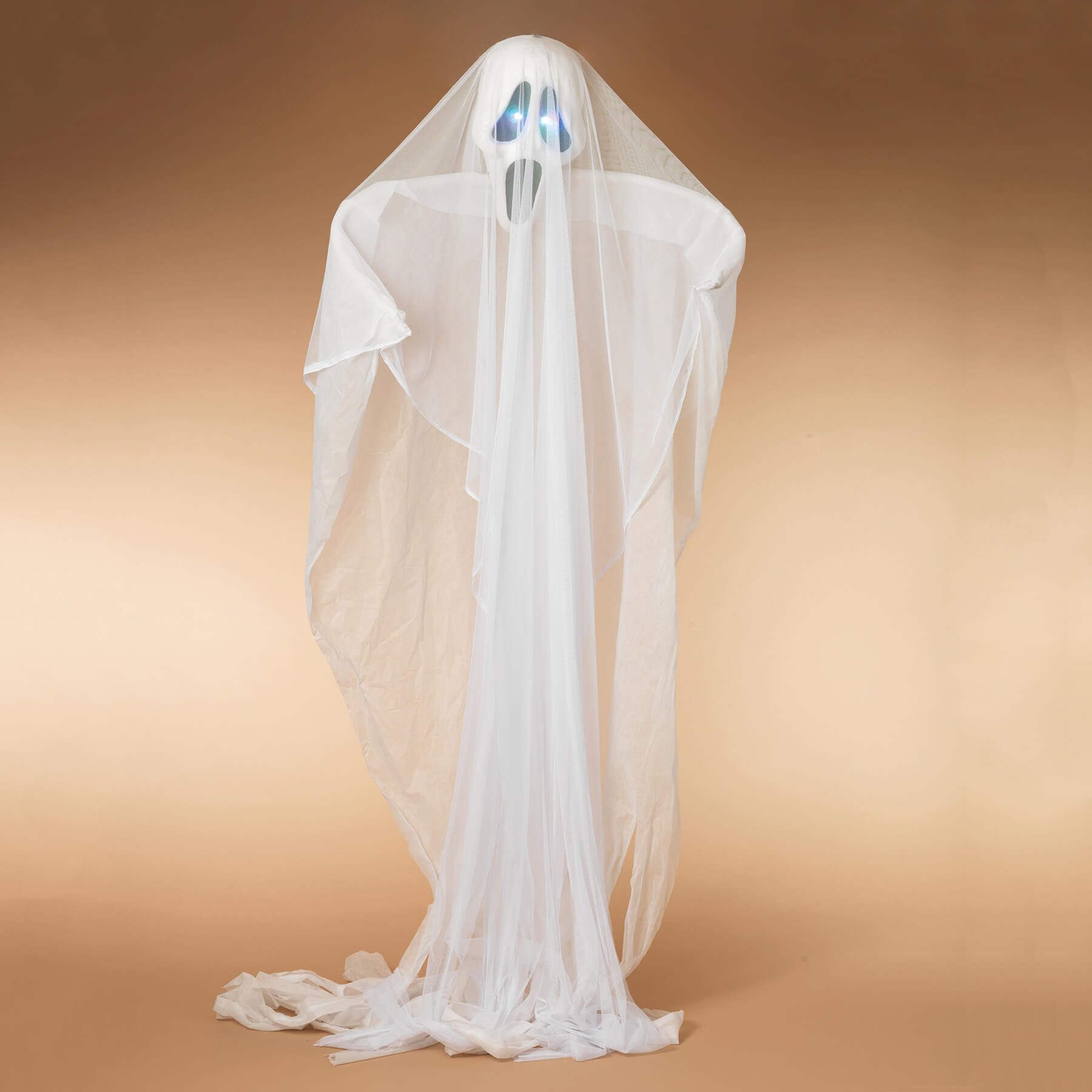 Make your Halloween decorations even spookier this year with the White Lighted Fabric Hanging Ghost! This 9-foot tall spook is sure to bring a chill to any Halloween decor. His gauzy fabric gives him an ethereal, supernatural look, almost like you can reach right through him. But it's his glowing eyes that make him downright haunting, those eyes will haunt you through the dark of a Halloween night. The classic white coloring helps this ghost really shine under the lights of your other Halloween decor too. Give your home an even spookier atmosphere this year with this massive looming ghost. And if you prefer a more subtle haunt you can check out the equally bone-chilling Black Lighted Fabric Hanging Ghost!