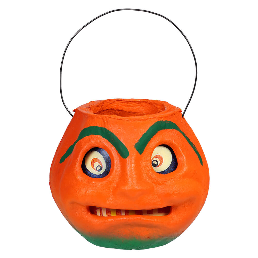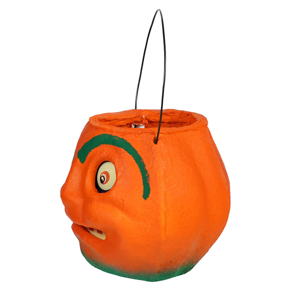 A Seasons Gone By design, made in America by Christopher James. Like any good jack o' lantern should be, this Wild-Eyed Pumpkin Bucket has just the right amount of spookiness with it's unnerving yellow, black and orange eyes and spooky grin. Like all Christopher James creations, this bucket is a fantastic display piece that could even be lit from within with a battery operated tea light.
