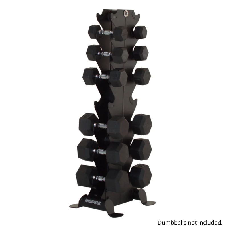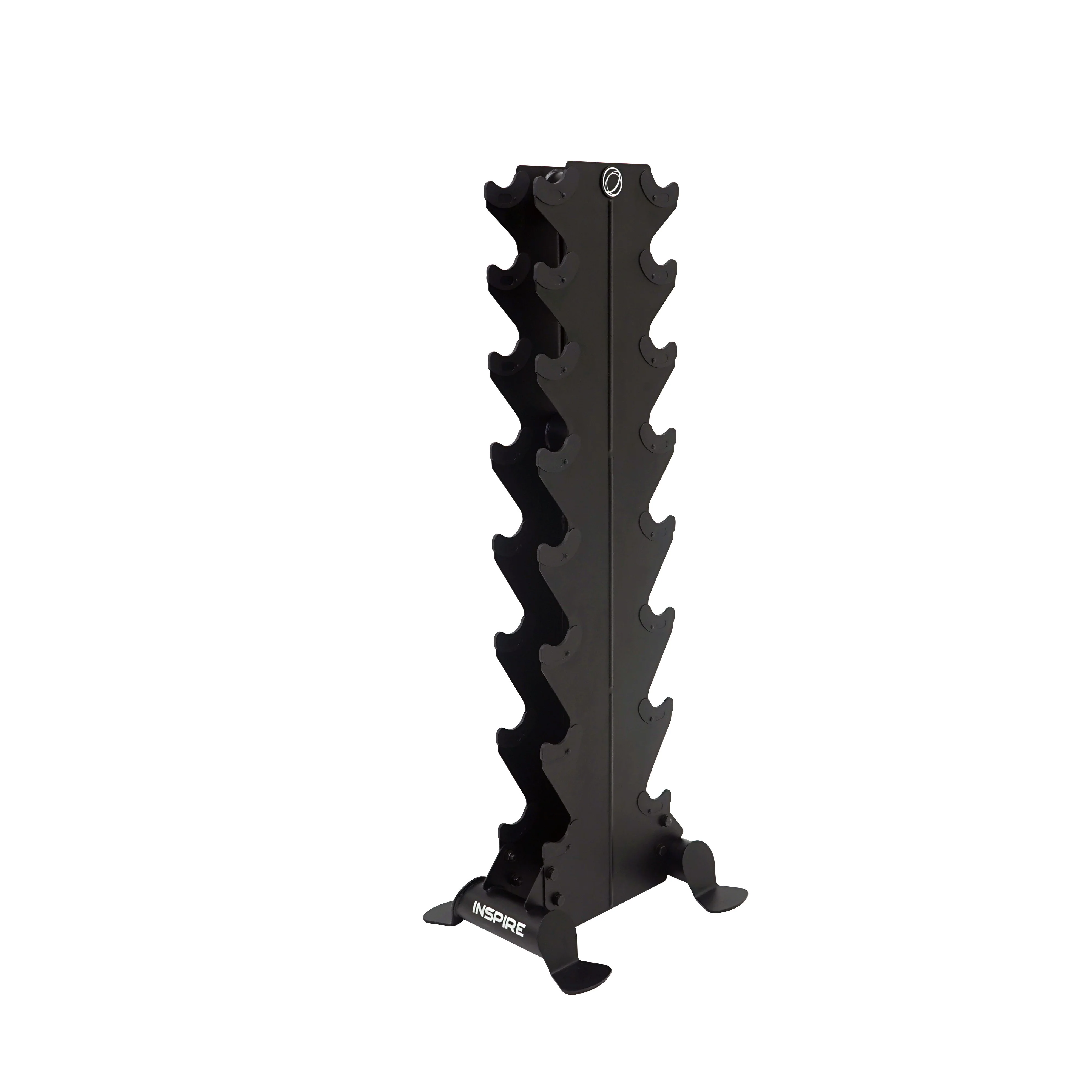 This vertical dumbbell stand holds up to 8 pairs of dumbbells, with a unique vertical design for a minimal footprint. Plastic shields cover each hook to protect both the rack and dumbbells from scratching.