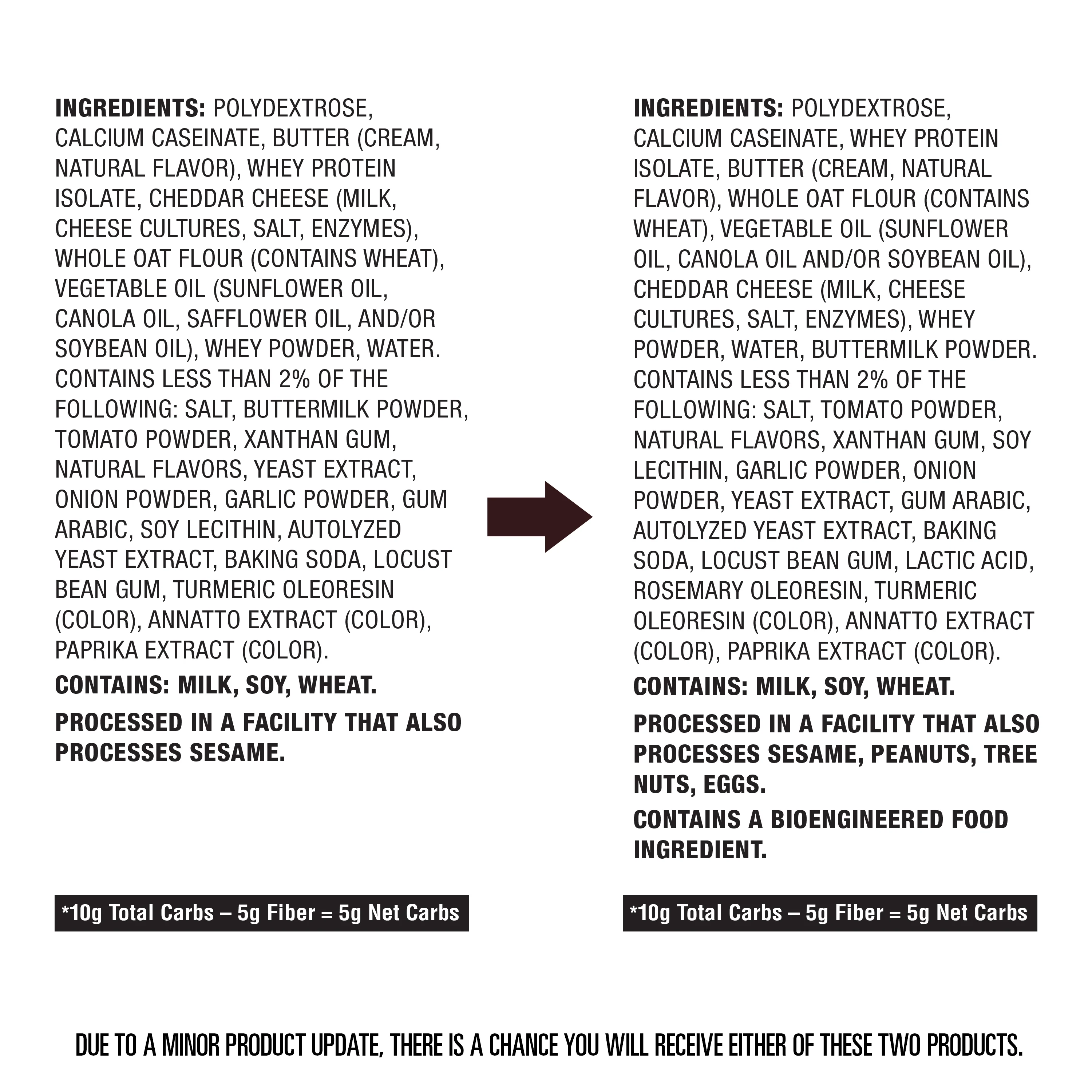 Polydextrose, Calcium Caseinate, Butter (Cream, Natural Flavor), Whey Protein Isolate, Cheddar Cheese (Milk, Cheese Cultures, Salt, Enzymes), Whole Oat Flour (Contains Wheat), Vegetable Oil (Sunflower Oil, Canola Oil. Safflower Oil, And/or Soybean Oil), Whey Powder Water. Contains Less Than 2% Of The Following: Salt, Buttermilk Powder, Tomato Powder, Xanthan Gum, Natural Flavors, Yeast Extract, Onion Powder, Garlic Powder, Gum Arabic, Soy Lecithin, Autolyzed Yeast Extract. Baking Soda, Locust Bean Gum, Turmeric Oleoresin (Color), Annatto Extract (Color), Paprika Extract (Color).