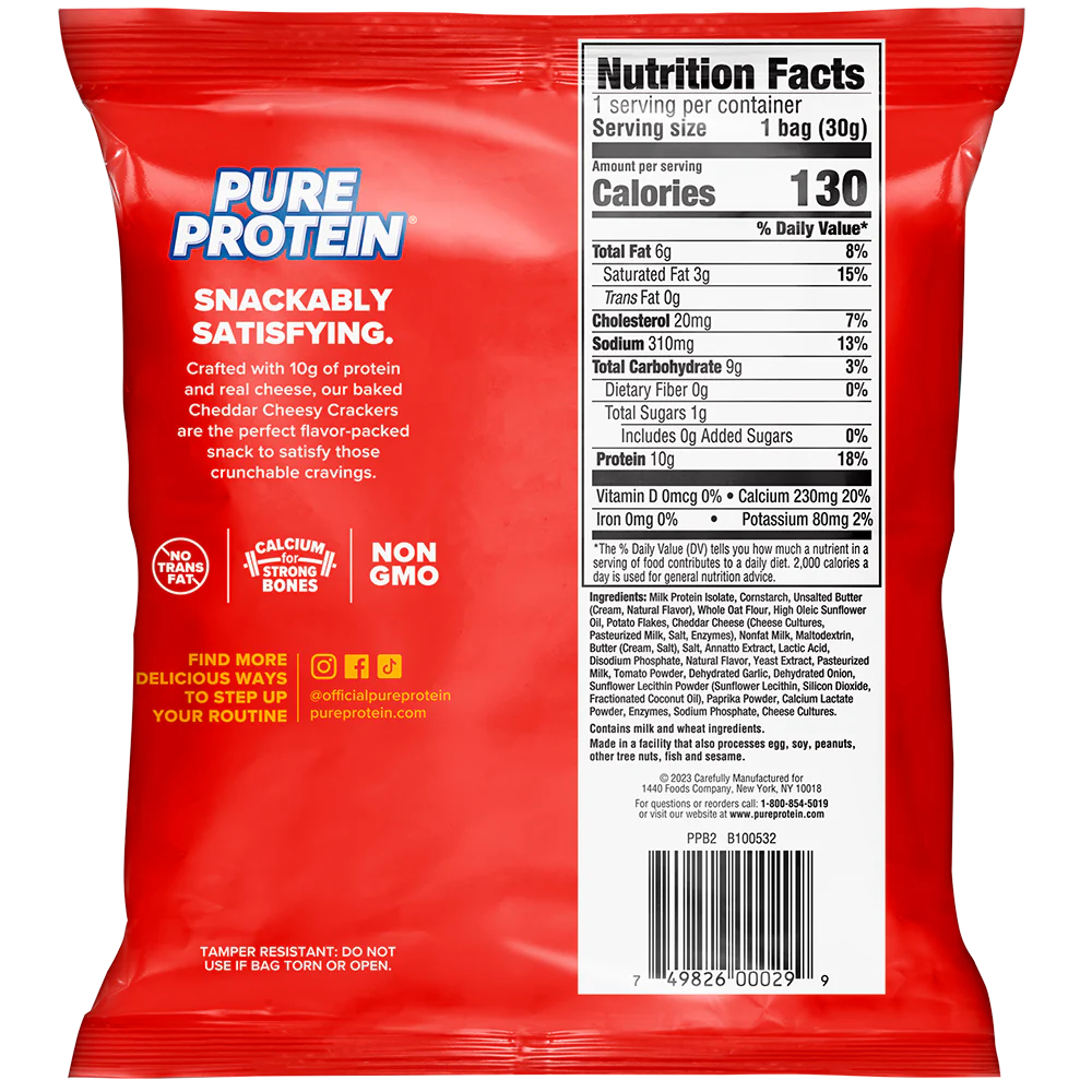 At Pure Protein, we believe in making high protein, low sugar(1) snacks that taste great. That's why our crunchy, savory Cheesy Crackers in Cheddar flavor are packed with 10g of protein and 1g of sugar per serving. Plus, they are made with real cheese, are non GMO and have no trans fat for a high-protein snack without all the guilt.