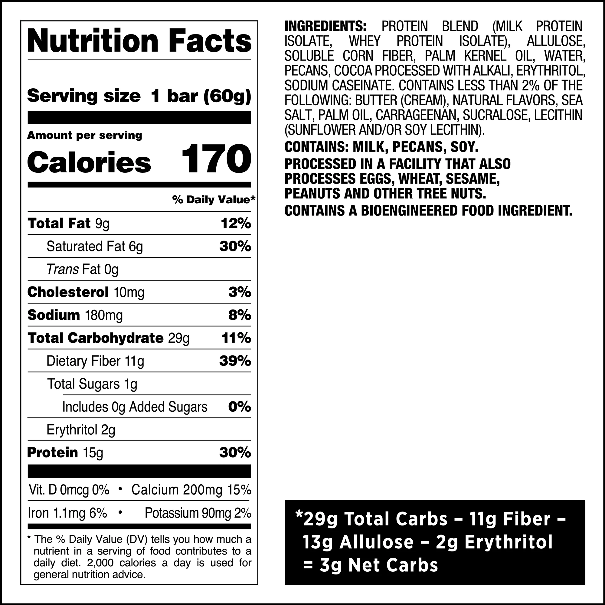 Protein blend (Milk Protein Isolate, Whey Protein Isolate), Allulose, Soluble Corn Fiber, Palm Kernel Oil, Water, Pecans, Cocoa Processed with Alkali, Erythritol, Sodium Caseinate. Contains Less Than 2% of the following: Butter (Cream), Natural Flavors, Sea Salt, Baking Soda, Sunflower Oil, Palm Oil, Inulin, Carrageenan, Sucralose, Sunflower Lecithin.