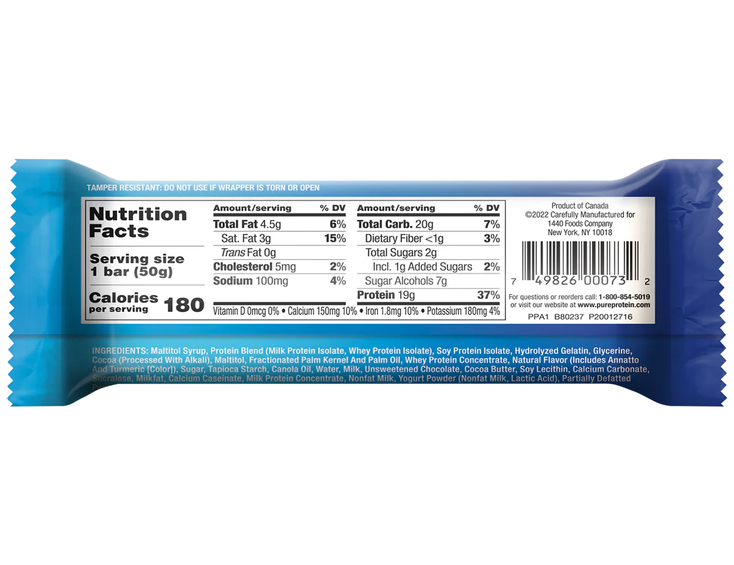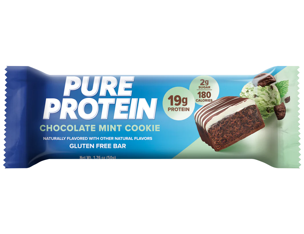 Pure Protein Chocolate Mint Cookie Protein Bars are delicious high protein snacks that support lean muscle and strength. Each chocolate mint cookie protein bar contains 19 grams of protein, 180 calories and 2 grams of sugar, for a great tasting and gluten free protein snack. Additionally, these high protein bars support your active lifestyle so toss them in your gym bag for a protein snack you can eat pre workout, post workout or on the go during a busy day. With tasty chocolate mint cookie flavor, it's easy to enjoy a Pure Protein bar any time of day. Pure Protein is proud to offer low sugar(1) protein bars with great taste. (1) Pure Protein products contain 5g sugar or less.