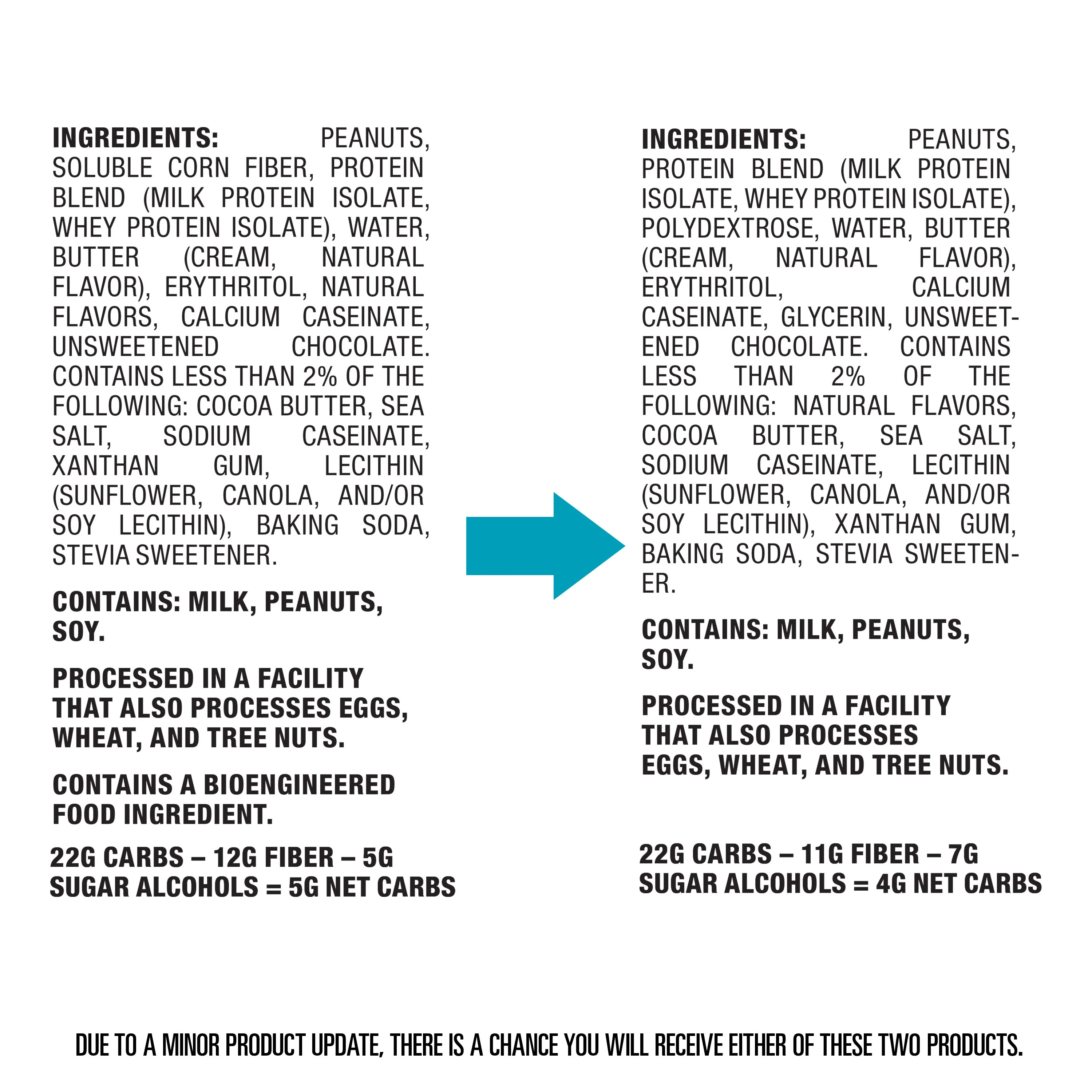 Peanuts, Soluble Corn Fiber, Protein Blend (Milk Protein Isolate, Whey Protein Isolate), Water, Erythritol, Butter (Cream, Natural Flavor), Natural Flavors, Calcium Caseinate, Unsweetened Chocolate. Contains Less Than 2% Of The Following: Cocoa Butter, Sea Salt, Sodium Caseinate, Xanthan Gum, Sunflower Lecithin, Baking Soda, Stevia Sweetener.