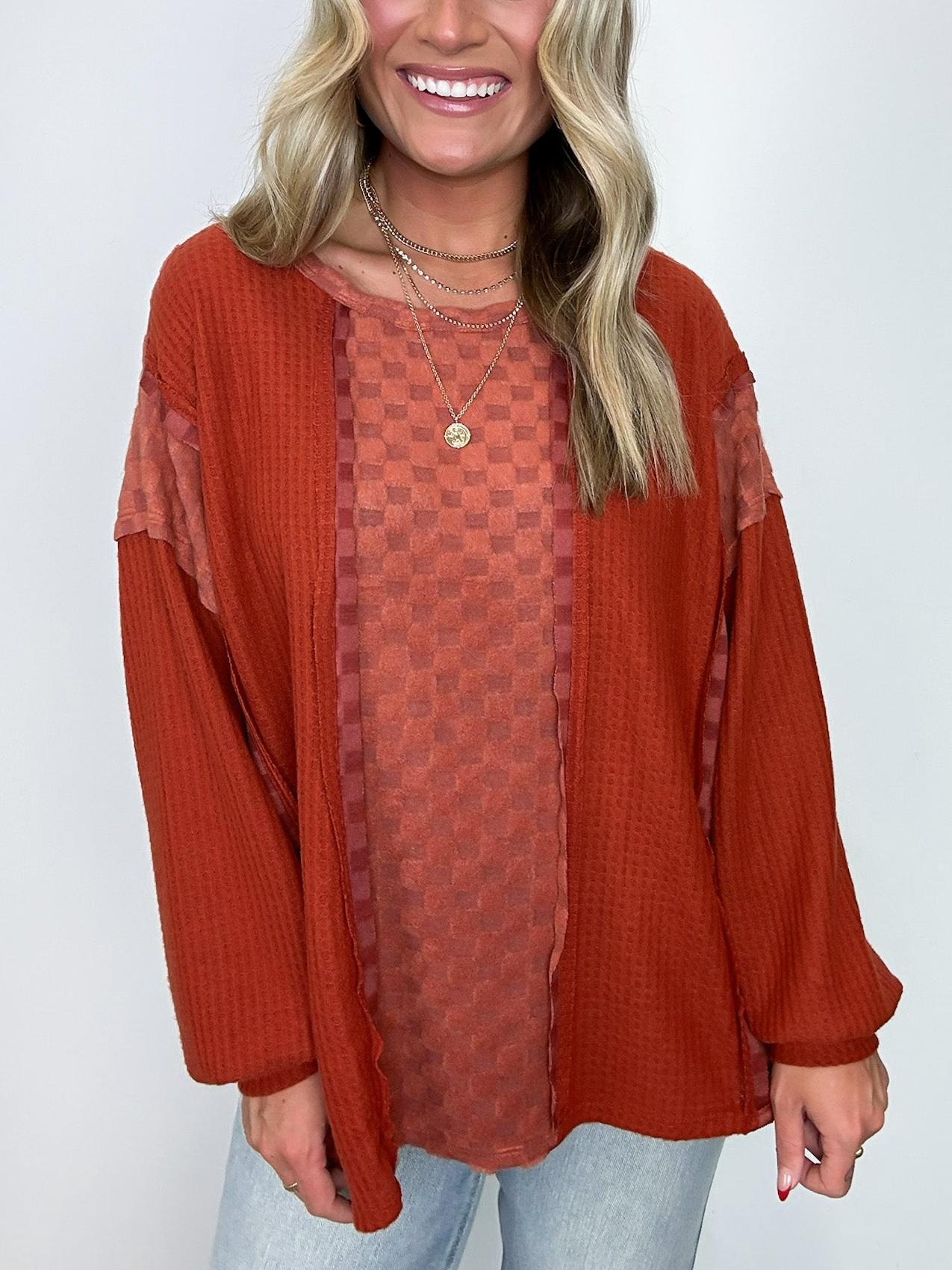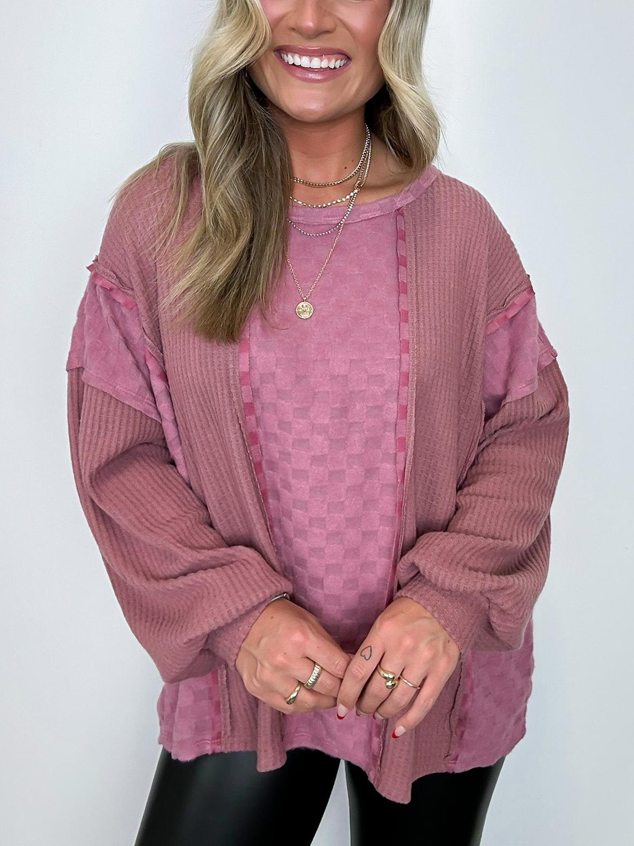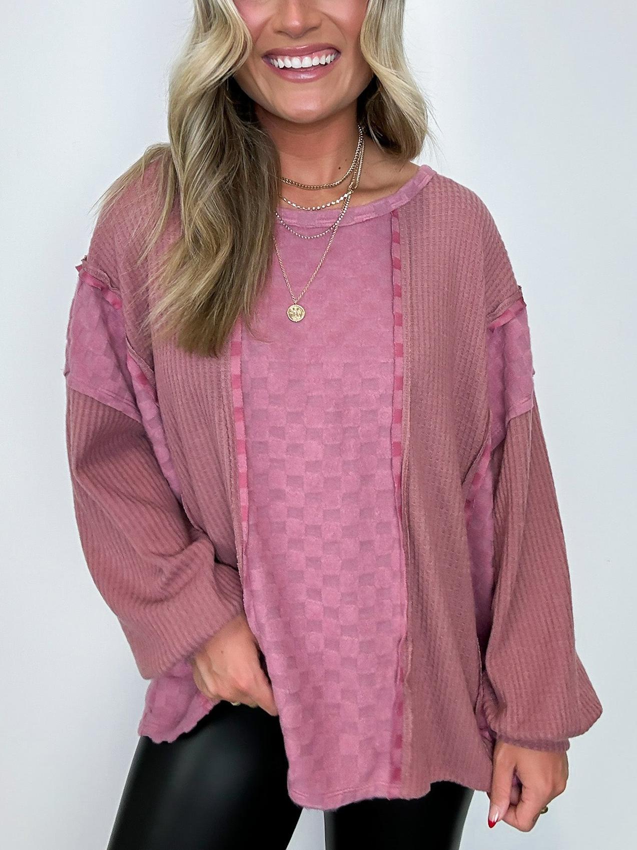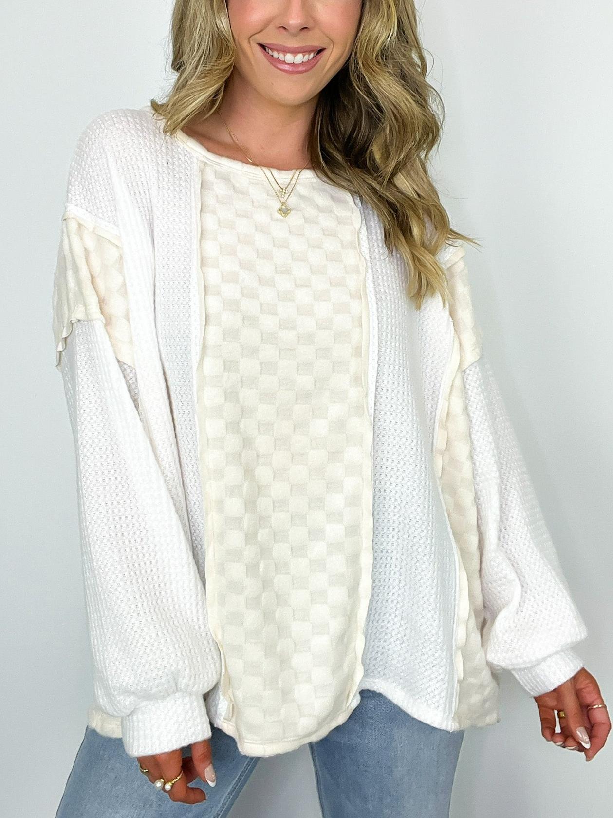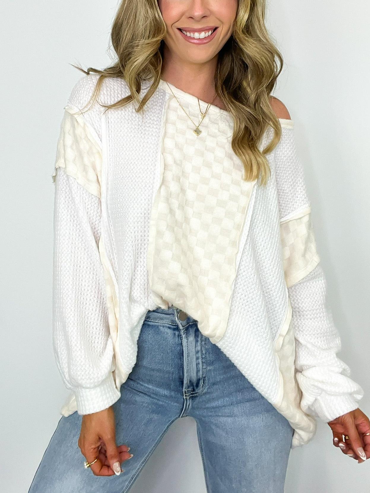 Get ready to check off your fashion goals with our Brushed Check Waffle Knit Top. The unique combination of brushed checker board and waffle design, along with open seam detailing, makes this top a must-have for any trendsetter. Stay cozy and stylish with this playful twist on a classic style.