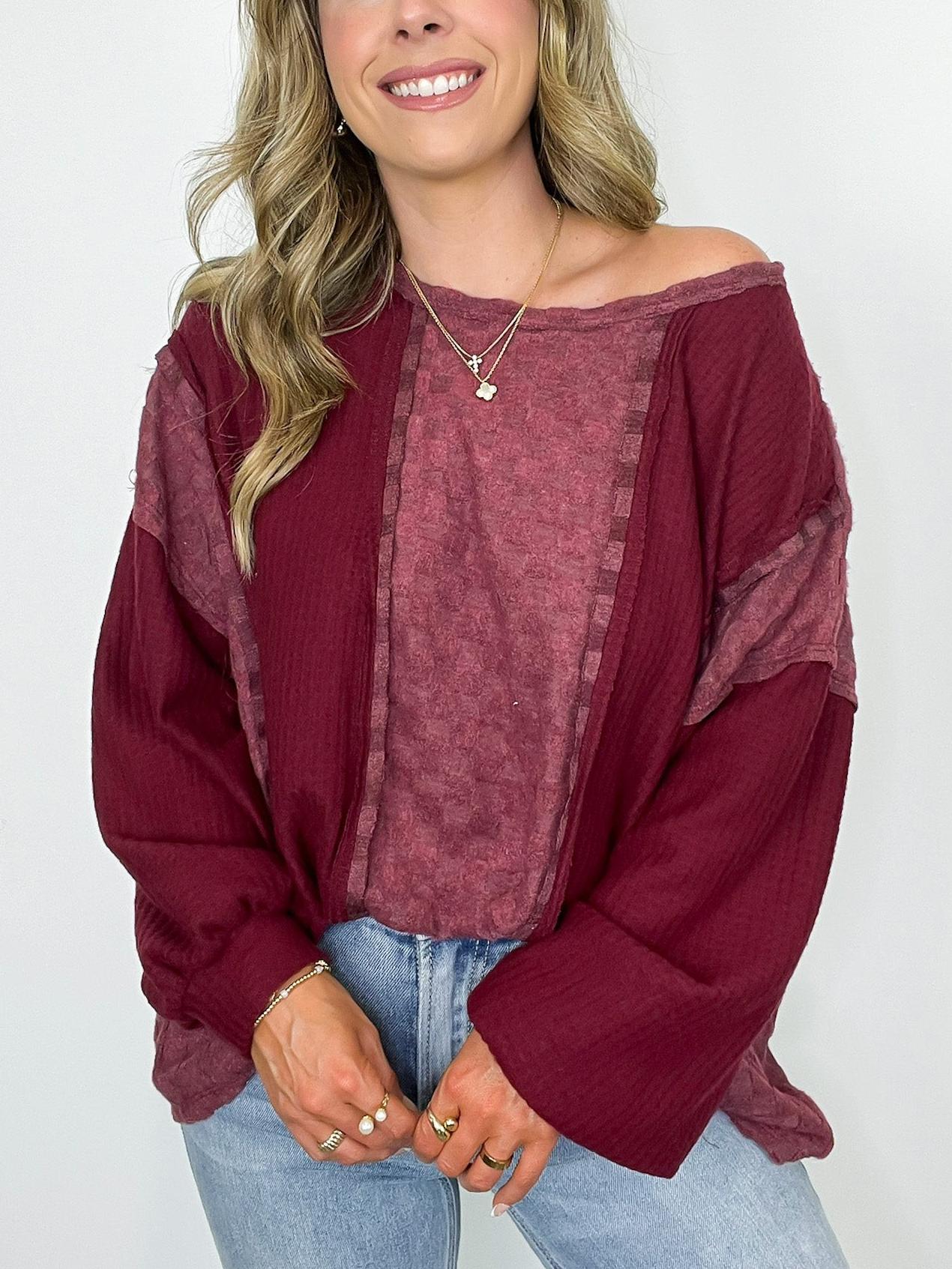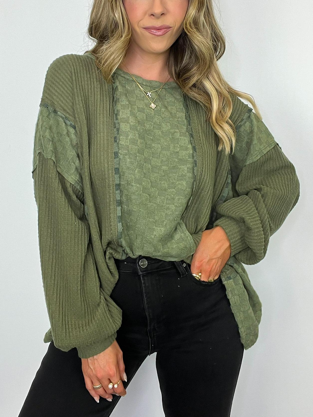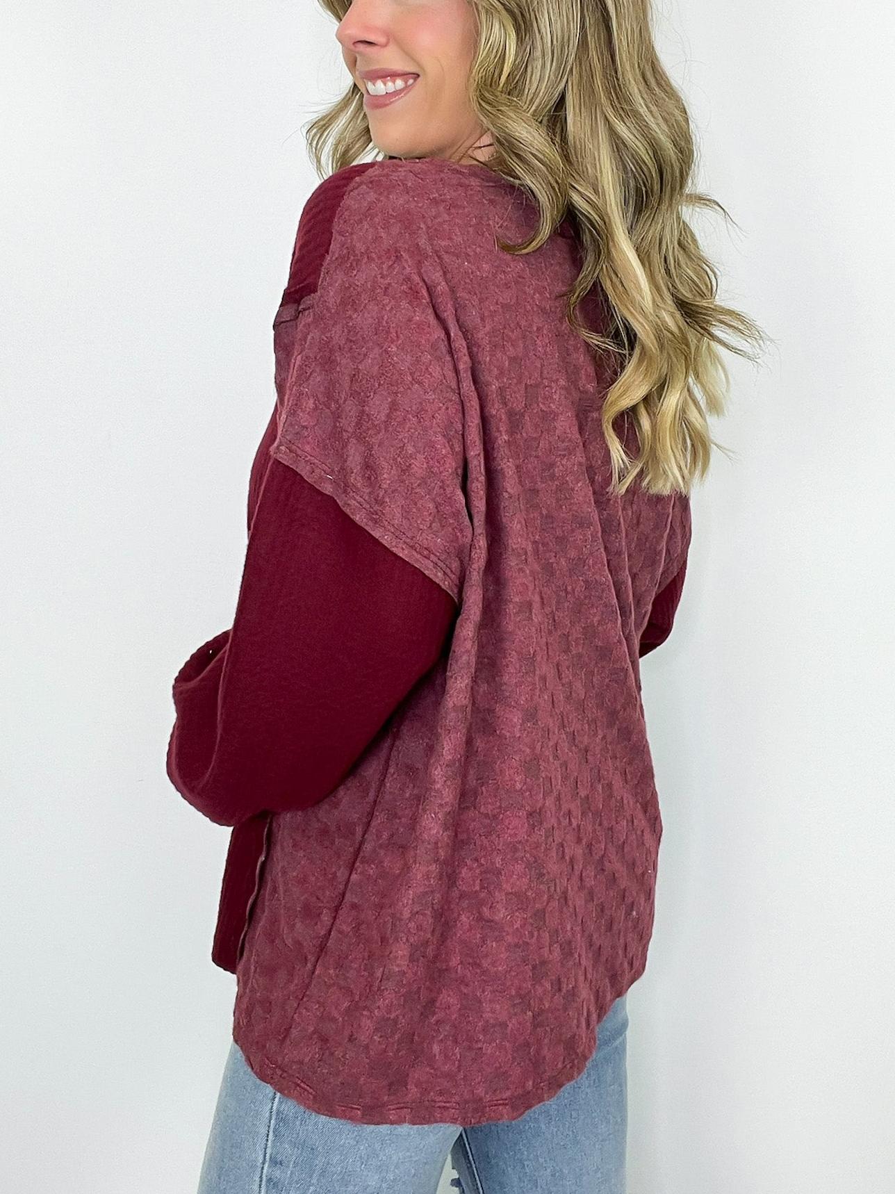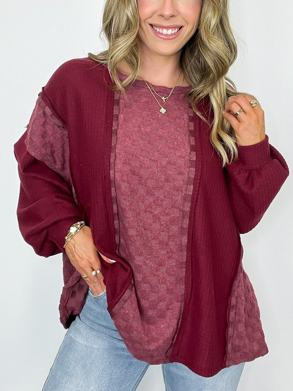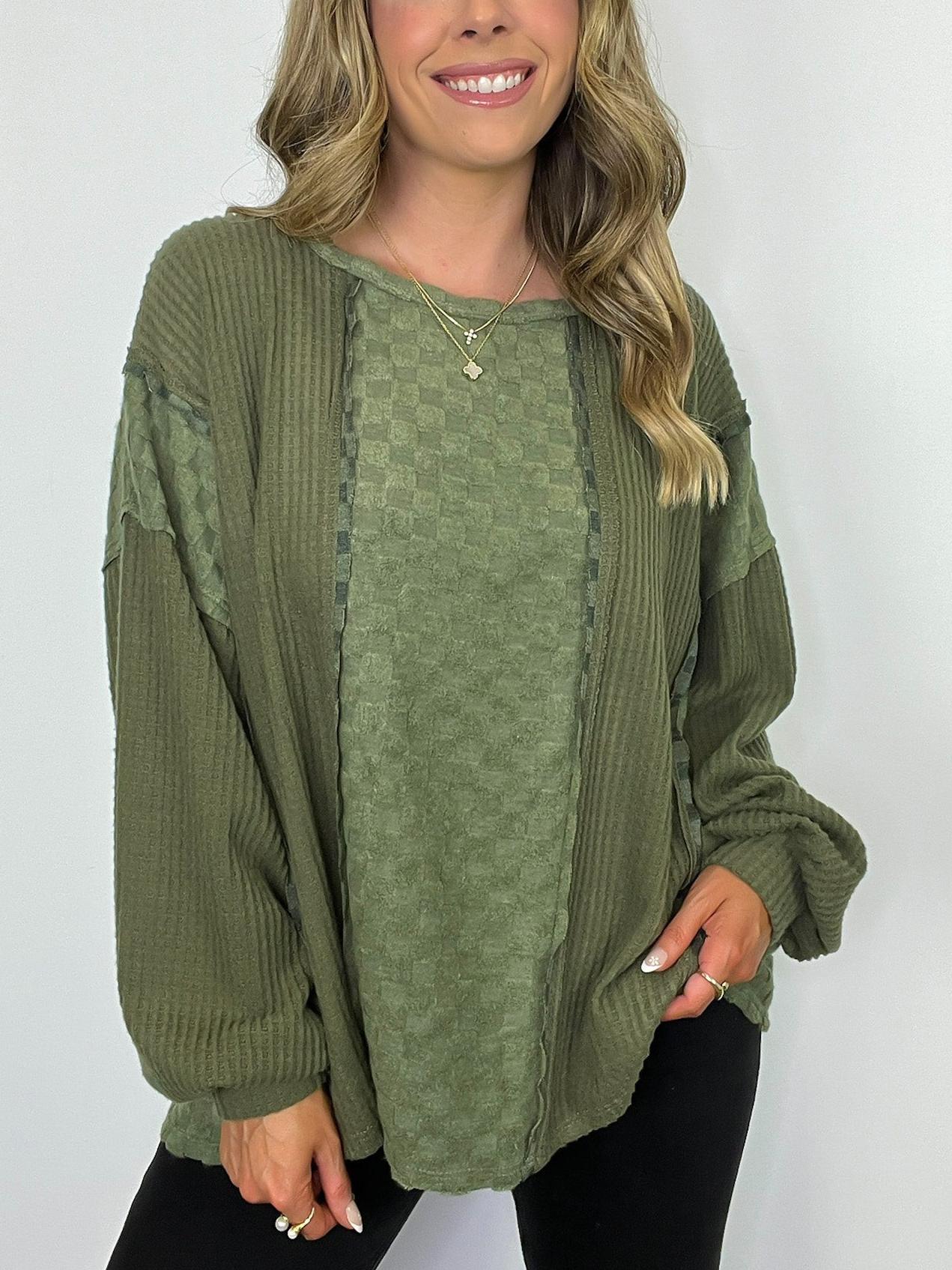 Get ready to check off your fashion goals with our Brushed Check Waffle Knit Top. The unique combination of brushed checker board and waffle design, along with open seam detailing, makes this top a must-have for any trendsetter. Stay cozy and stylish with this playful twist on a classic style.