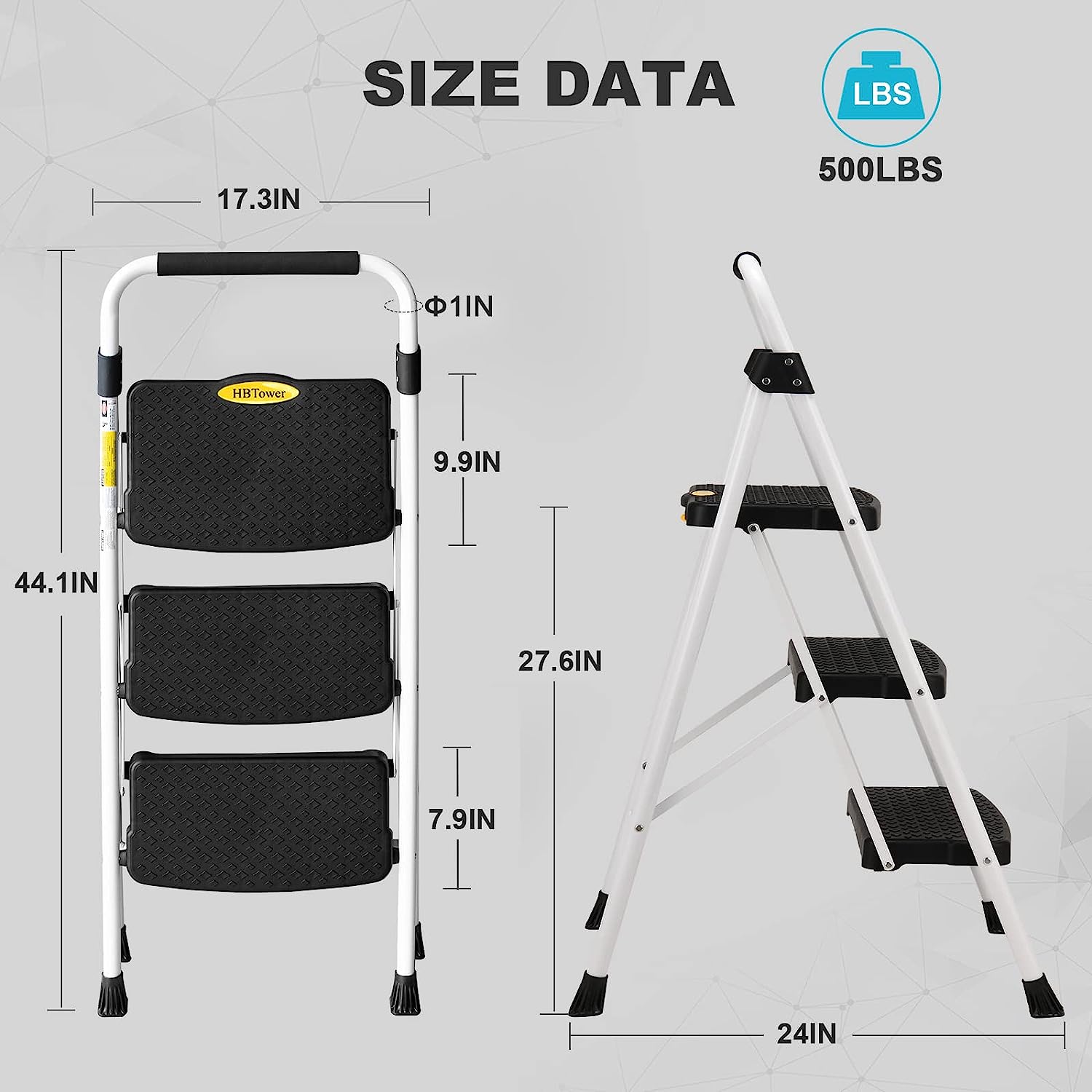 - 2023 UPGRADE STEP LADDER—Open: 20.1" x 26.8" x 40.9", Folded: 44.5" X 20.1" X 1.6", Net Weight: 11.5 pounds, Maximum Load: 500 pounds. Safety Folding 3 Step Steel Ladder is made for you!
