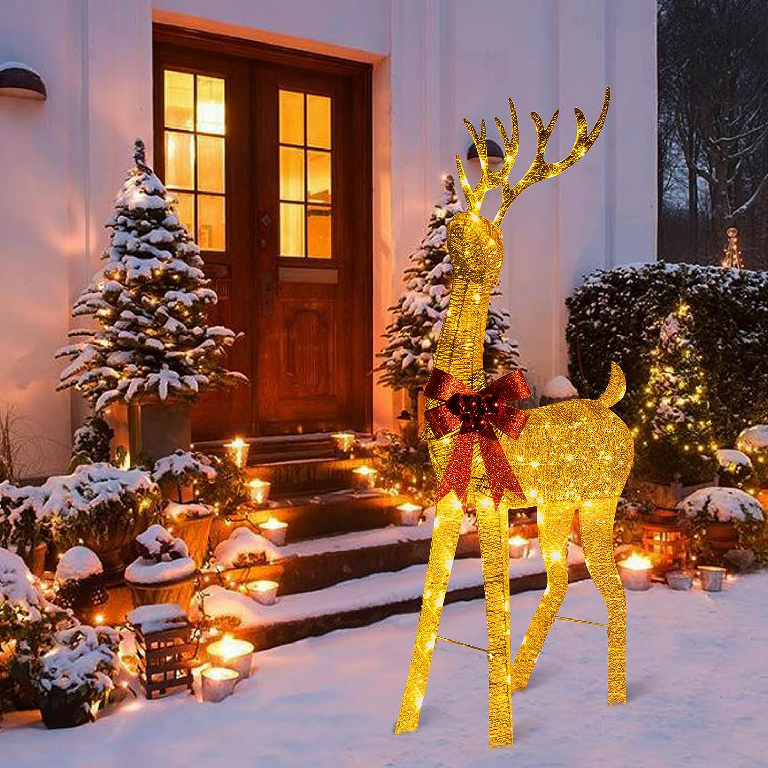 Burlap reindeer is covered with warm lights and its head positioned up to the falling snow. Features: Color: warm white bulbs/brown wire. Number of bulbs on string: 150. Bulb size: mini. 26 in. lead cord (spacing from the plug to the deer decoration). Additional product features: 3-dimensional decoration. Includes replacement bulbs and fuse. Some quick and easy assembly required. Includes 4 lawn stakes and zip cords. UL listed for indoor/outdoor use. 120-Volt 60 Hz 0.51 Amp 61.2 Watt. Approximate Dimensions: 60 in. H x 36 in. W x 12 in. D. Material(s): metal/net fabric/wire.