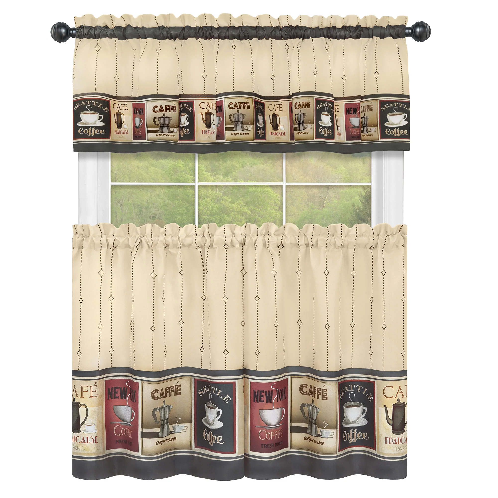 This set adds charm and functionality to your kitchen space. Designed to fit standard and decorative rods, it accommodates windows up to 36 inches wide. The Tan/Black color scheme complements various decor styles, adding a cozy ambiance to your kitchen.
