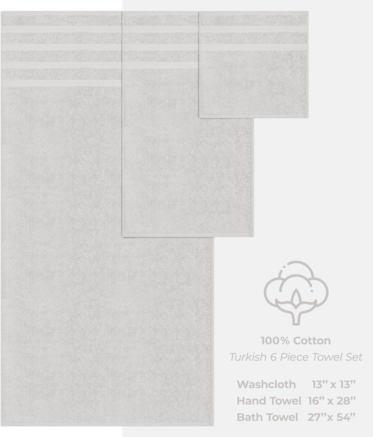 - ✅ Turkish Luxury 6 Piece Towel Set Includes 2 Bath Towels of 27 x 54 inches, 2 Hand Towels of 16 x 28 inches and 2 Washcloths of 13 x 13 inches.