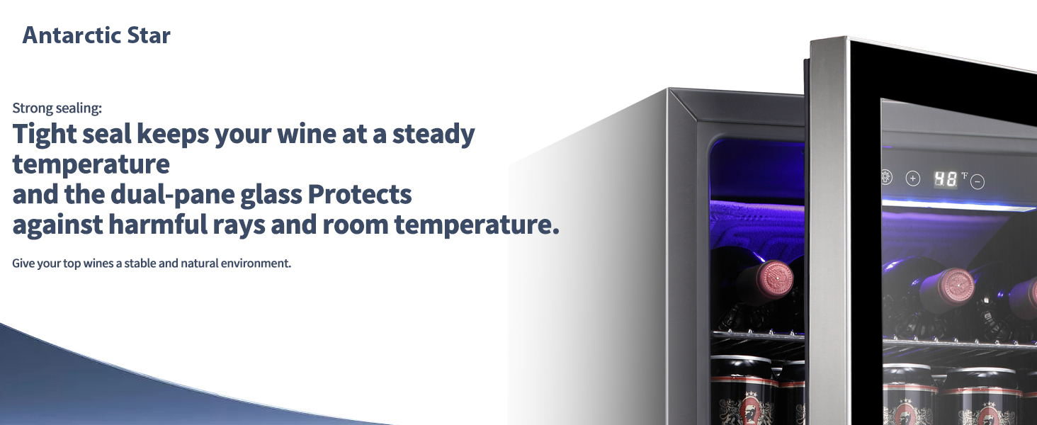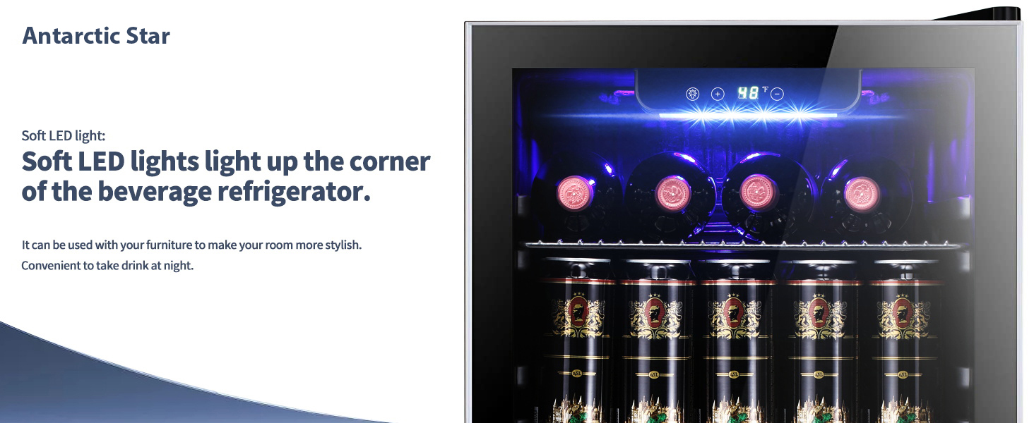 - IDEAL LIGHT and HUMIDITY: The reinforced glass door with air tight seal helps to maintain an ideal humidity level, this beverage refrigerator gives you a compact and modern sensation. Perfect for your living room. Blue soft LED interior lighting not only beautifully showcases the wine but won’t damage the wine.