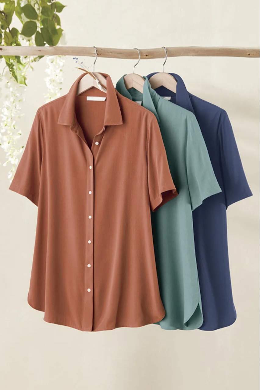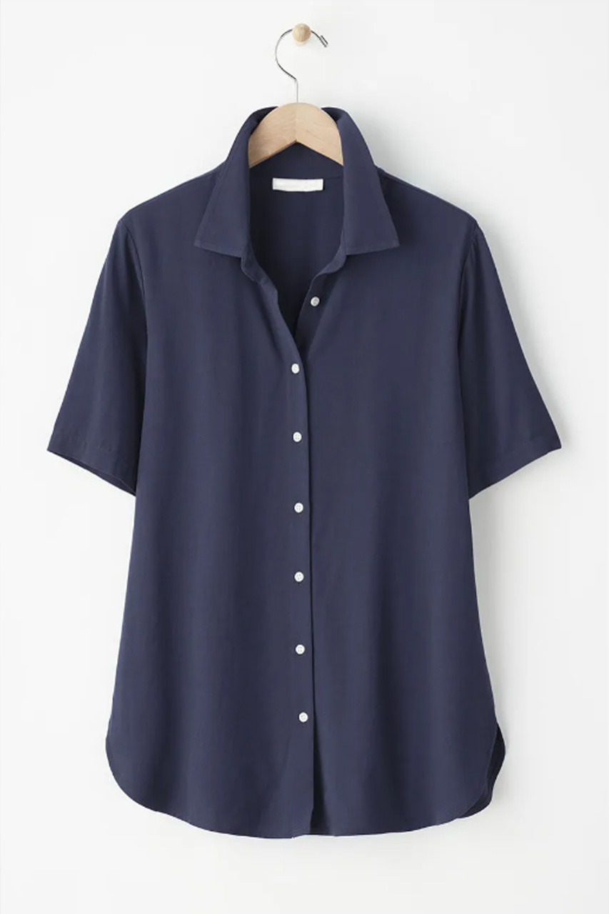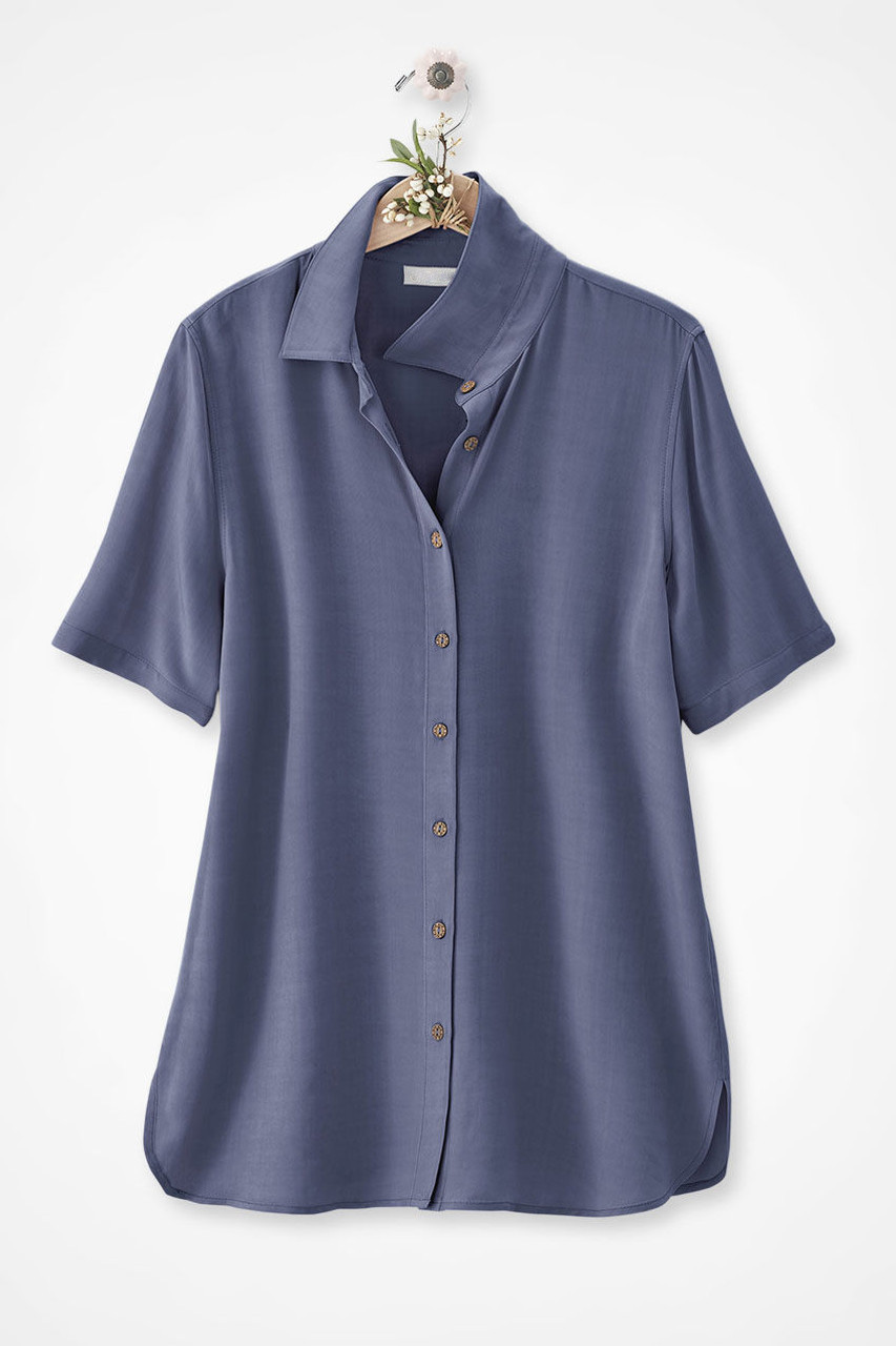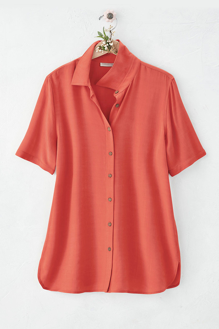 A bestseller for its softness, beautiful drape and casual versatility, our button-front Bistro Shirt is back with a refined feminine fit and longer length. Straight hem with rounded side slits. Imported.