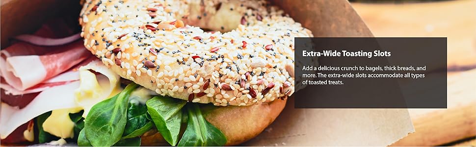 - Extra-Wide Toasting Slots - Add a delicious crunch to bagels, thick breads, and more. The extra-wide slots accommodate all types of toasted treats