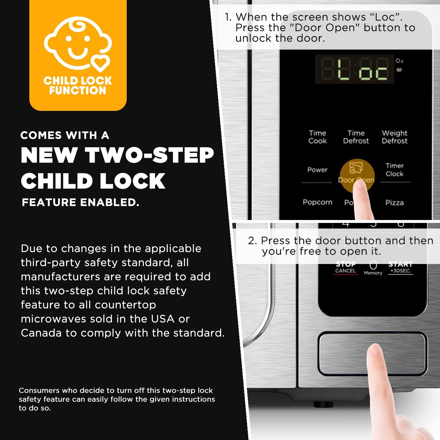 - Large LED digital display, easy-to-read control panel, child safety lock, interior light, removable 10” glass turntable