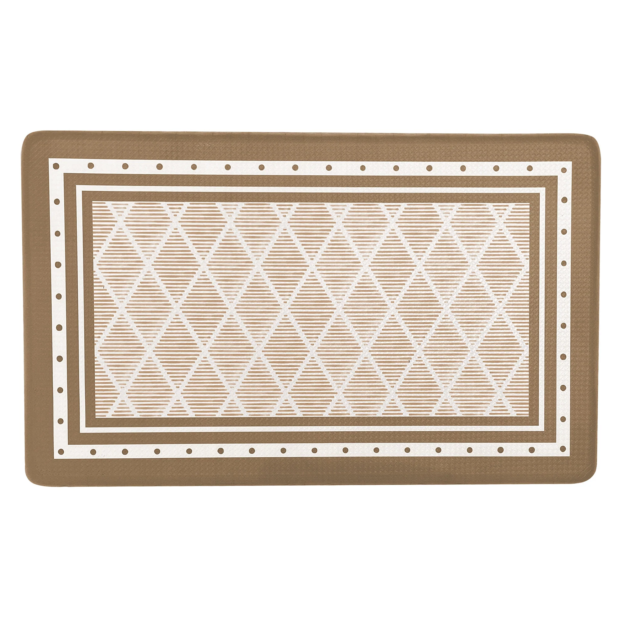 Revamp your kitchen with this trendy boho geometric anti-fatigue mat. Its eye-catching design adds a touch of personality to your space, while the plush polypropylene top and eco-friendly PVC foam core provide ultimate comfort. The mat's beveled edge gives it a sleek look, and its non-slip, quick-drying, and stain-resistant features make it both stylish and practical. Stand comfortably and confidently while cooking up your favorite meals.