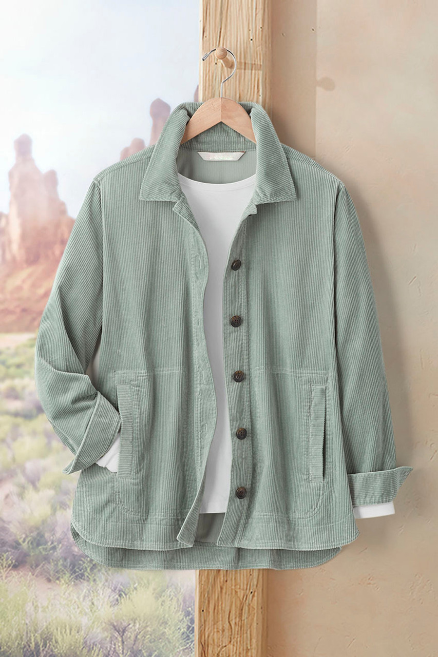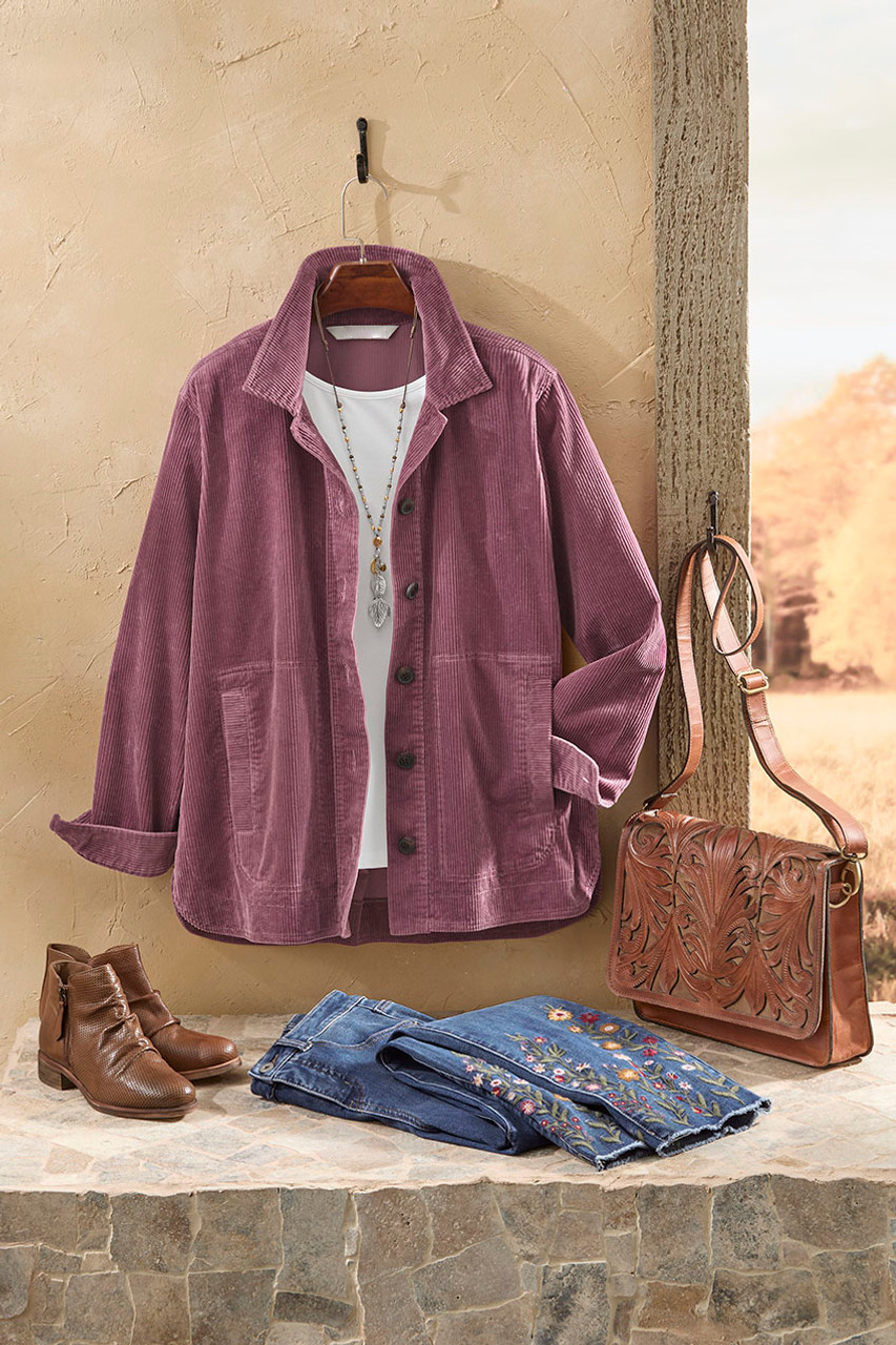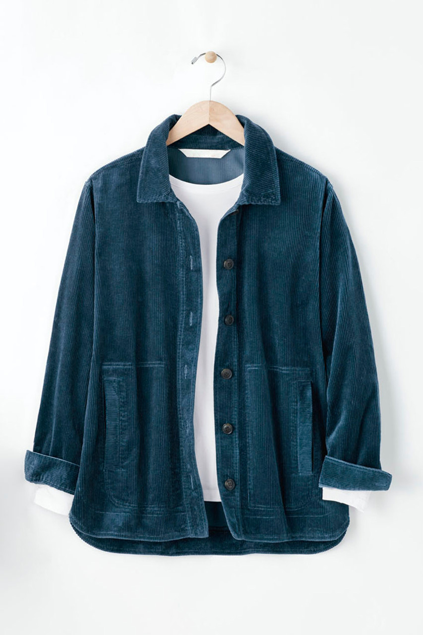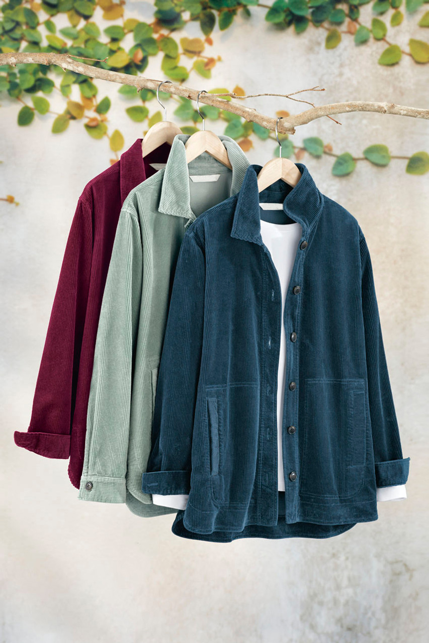 Soft-brushed, 8-wale corduroy matches the season, no matter how you wear it. Shirt-jacket style can be worn solo or as a layering piece – slightly dropped shoulder seams create a roomier fit with a casual, laidback feel. Side pockets, back box pleat and slight high-low shirttail hem.