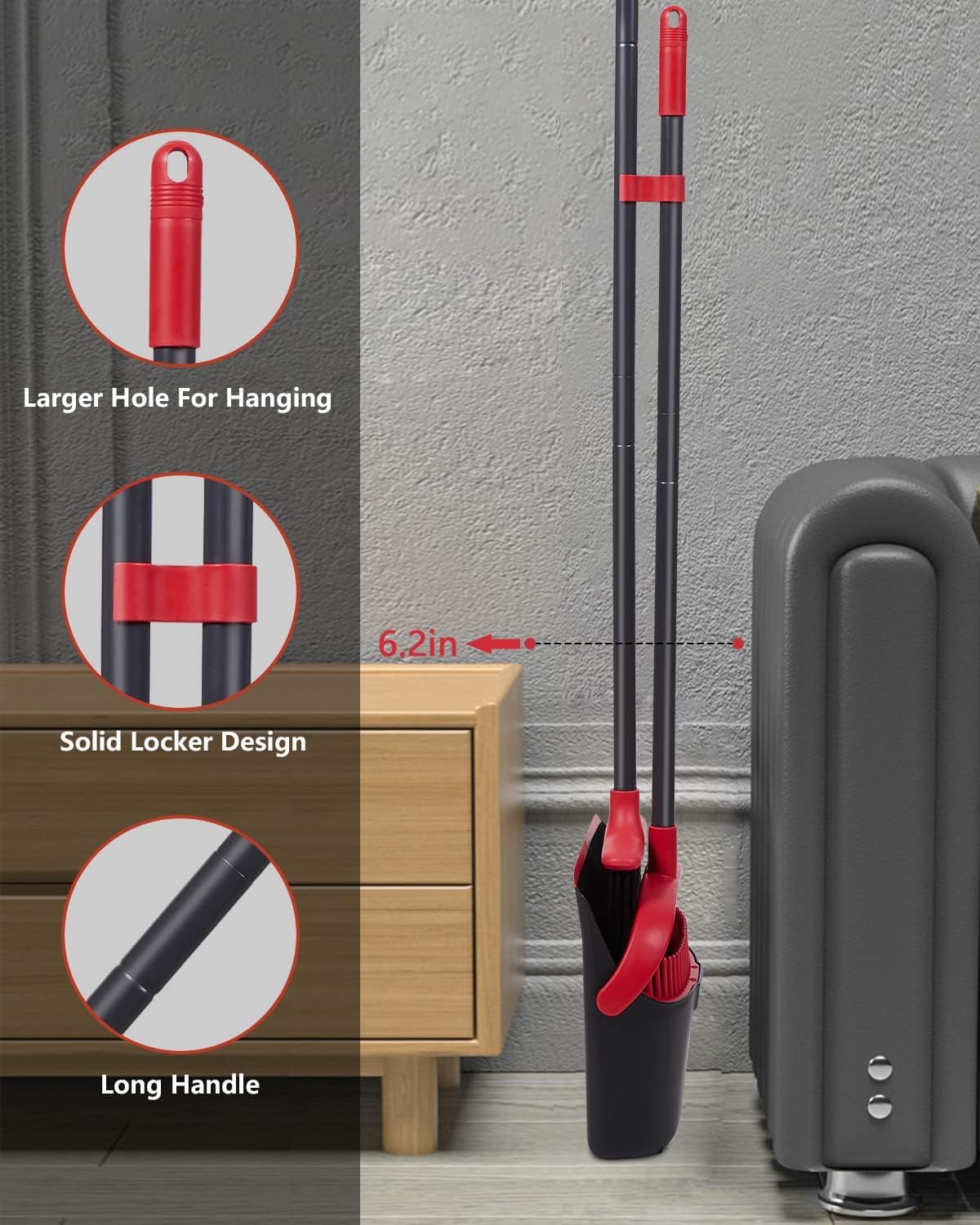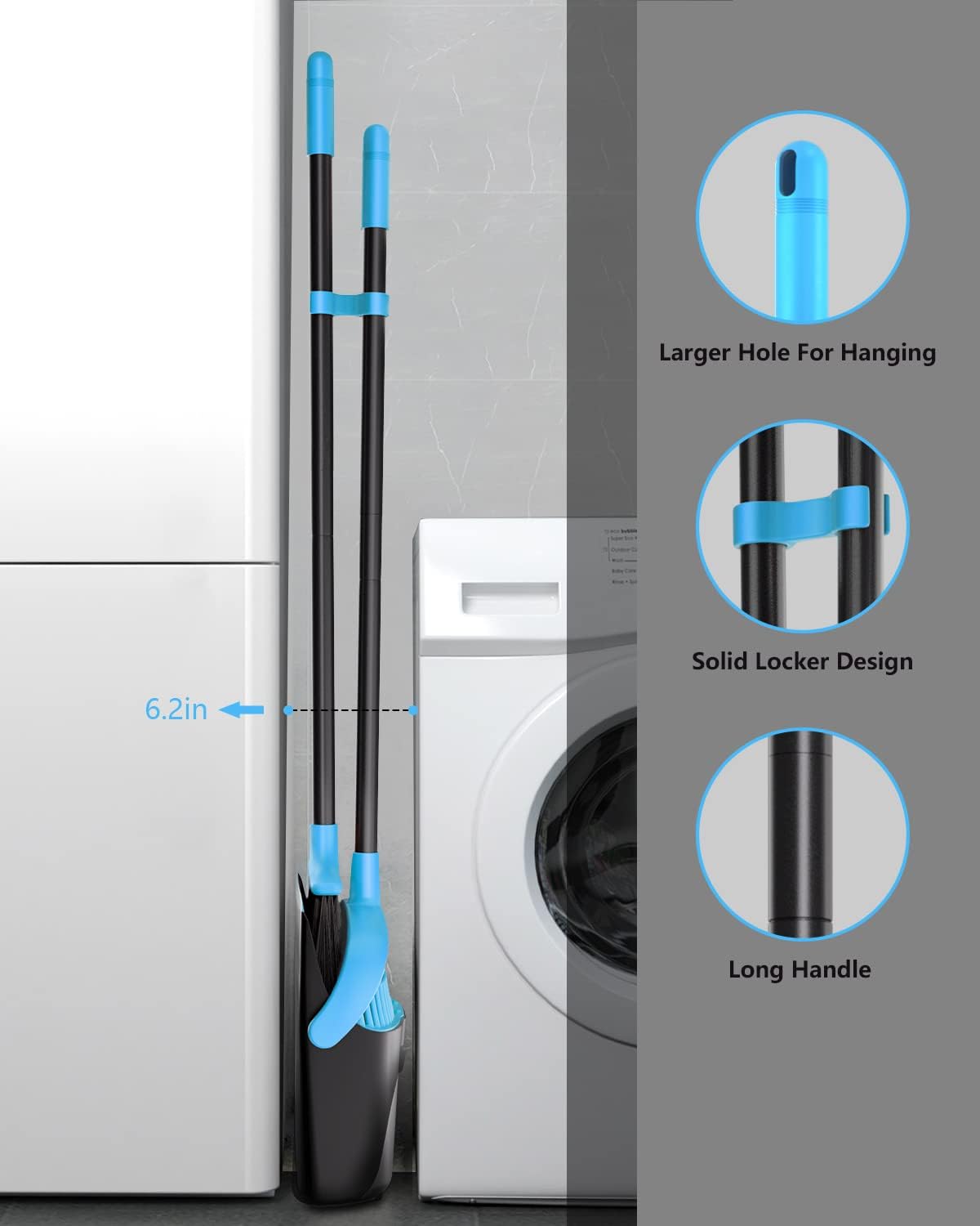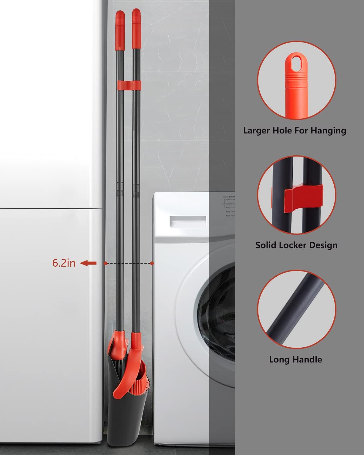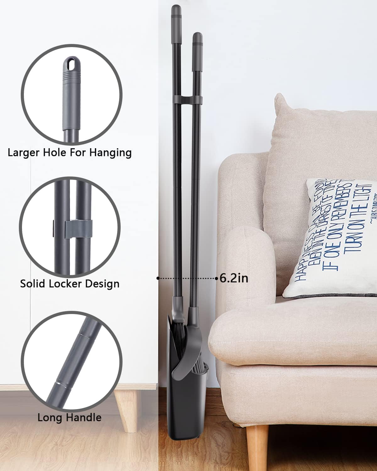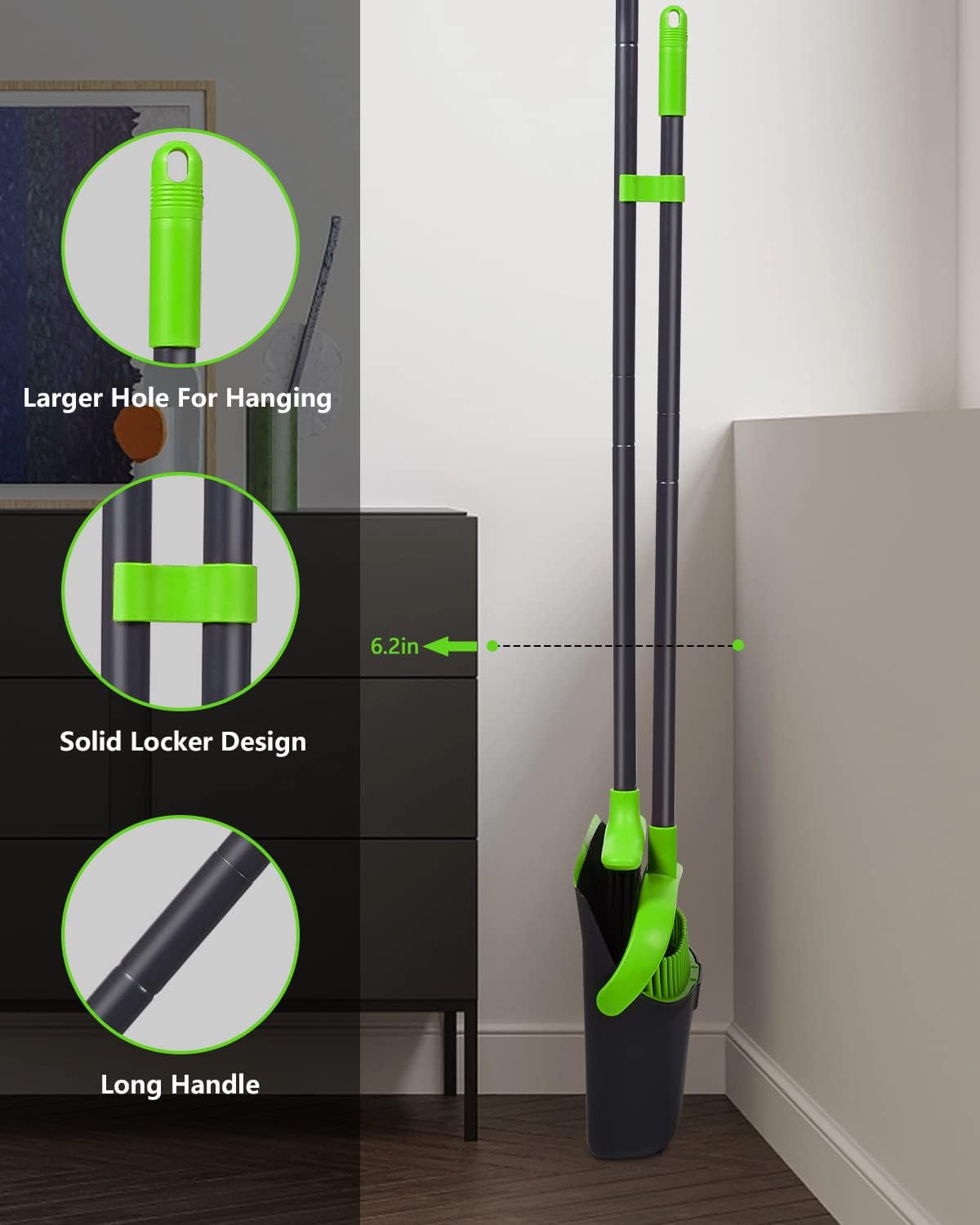 - Dustpan Locks: Standing dustpan locks in open position for easy emptying , can easily dispose of dustpan's contents into the garbage. compact broom dustpan set design lets you hang the broom and dustpan together on the wall. It is a great way to save storage space.