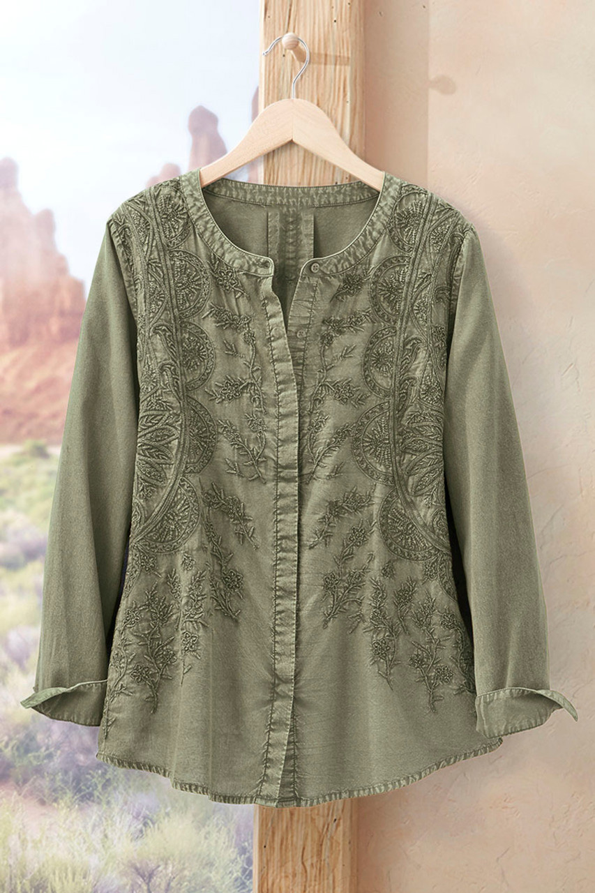 Elaborate tonal embroidery gives this top a rich, embossed look. Soft-washed and versatile, it wears beautifully on its own or unbuttoned as a light layer. Hidden button front, back knife pleat, curved hem.
