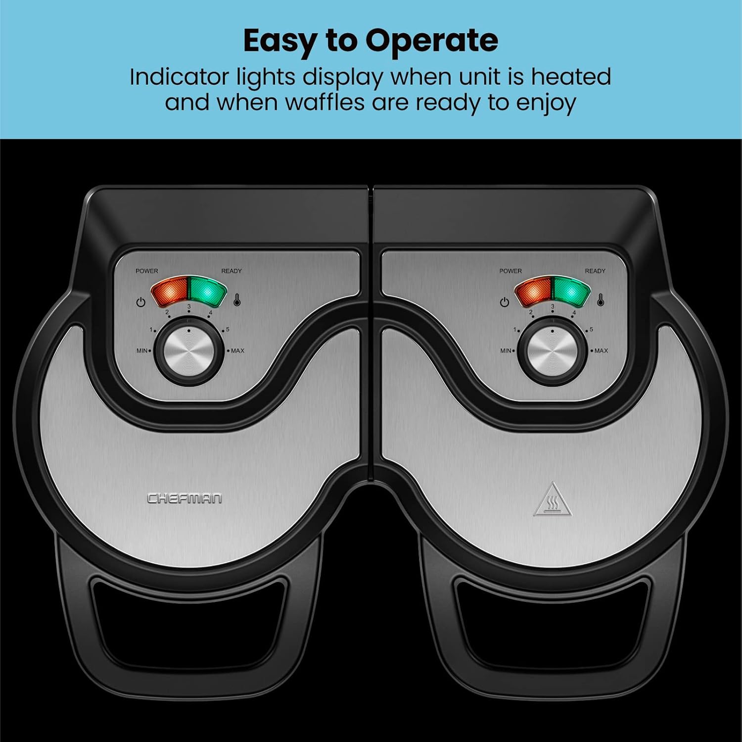 • Chefman Anti-Overflow Belgian Waffle Maker w/Shade Selector, Temperature Control, Mess Free Moat, Round Iron w/Nonstick Plates & Cool Touch Handle, Measuring Cup Included, Black