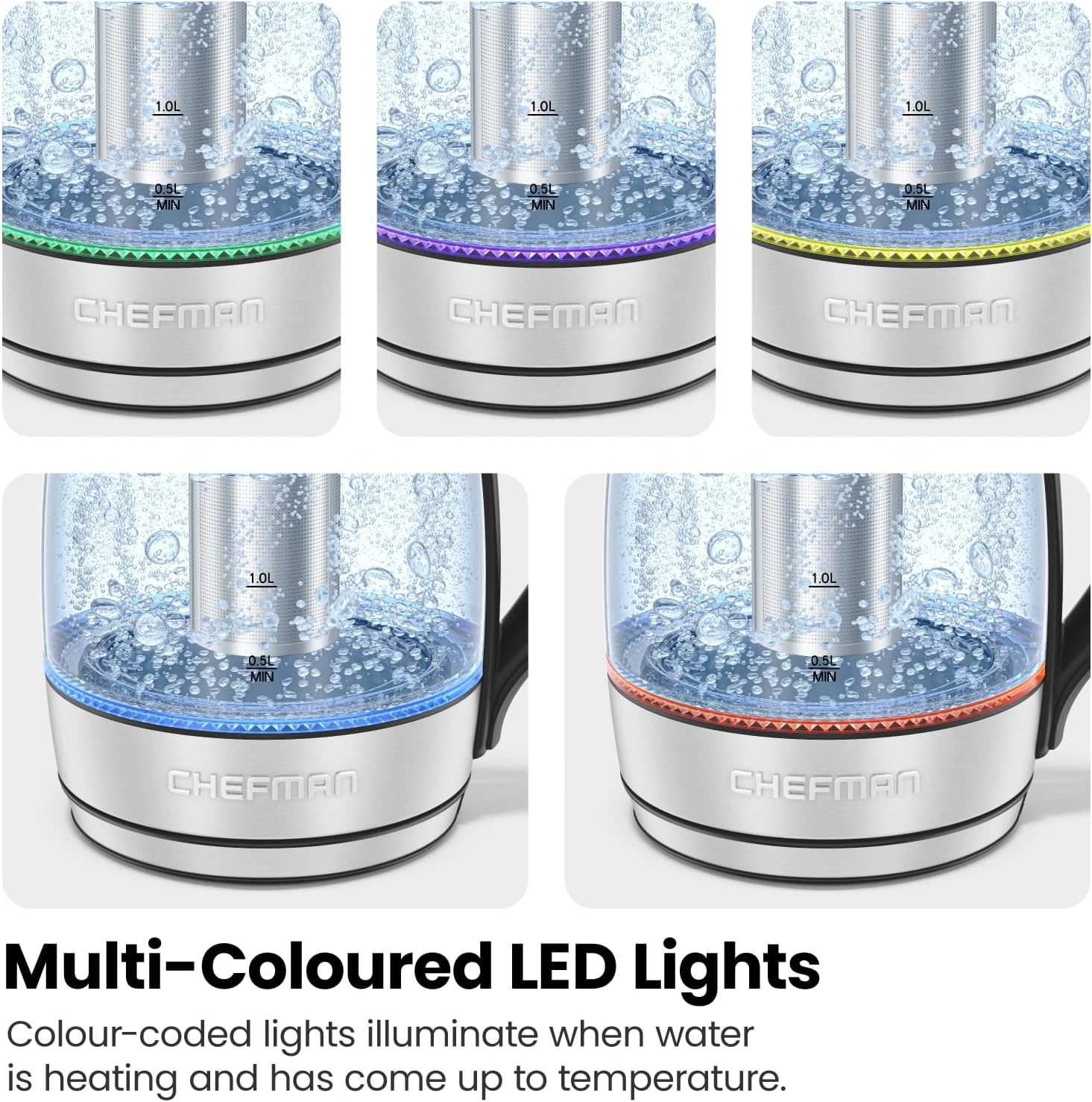 - TRI-COLOR LED LIGHTS: Easily see when your glass teapot with infuser is in standby mode (white lights), heating mode (red lights), and in keep warm/steep mode (green lights)