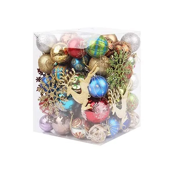 Why choose our Christmas Tree Ornaments Set -Shatterproof: high quality material and strict QC, you will never get the inferior products. -Technology: PS material+Electroplating+Powder gluing. -Sumptuous combination of Christmas tree ornaments: 60-70 pcs Random Christmas Ornaments.One box can meet your various needs.