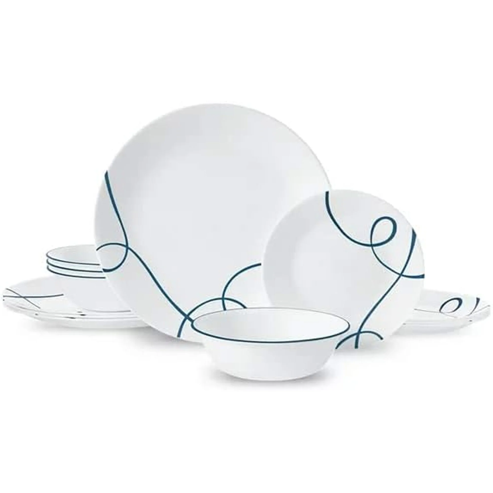 Ditch the boring dishes! The Corelle Lia 12-Piece Dinnerware Set adds a pop of personality to your table. This service for four features a stunning design with swirls of cobalt blue dancing across classic white plates and bowls. Crafted from Corelle's ultra-tough Vitrelle glass, this set is as durable as it is chic, resisting chips, cracks, and scratches no matter how lively your meals get.