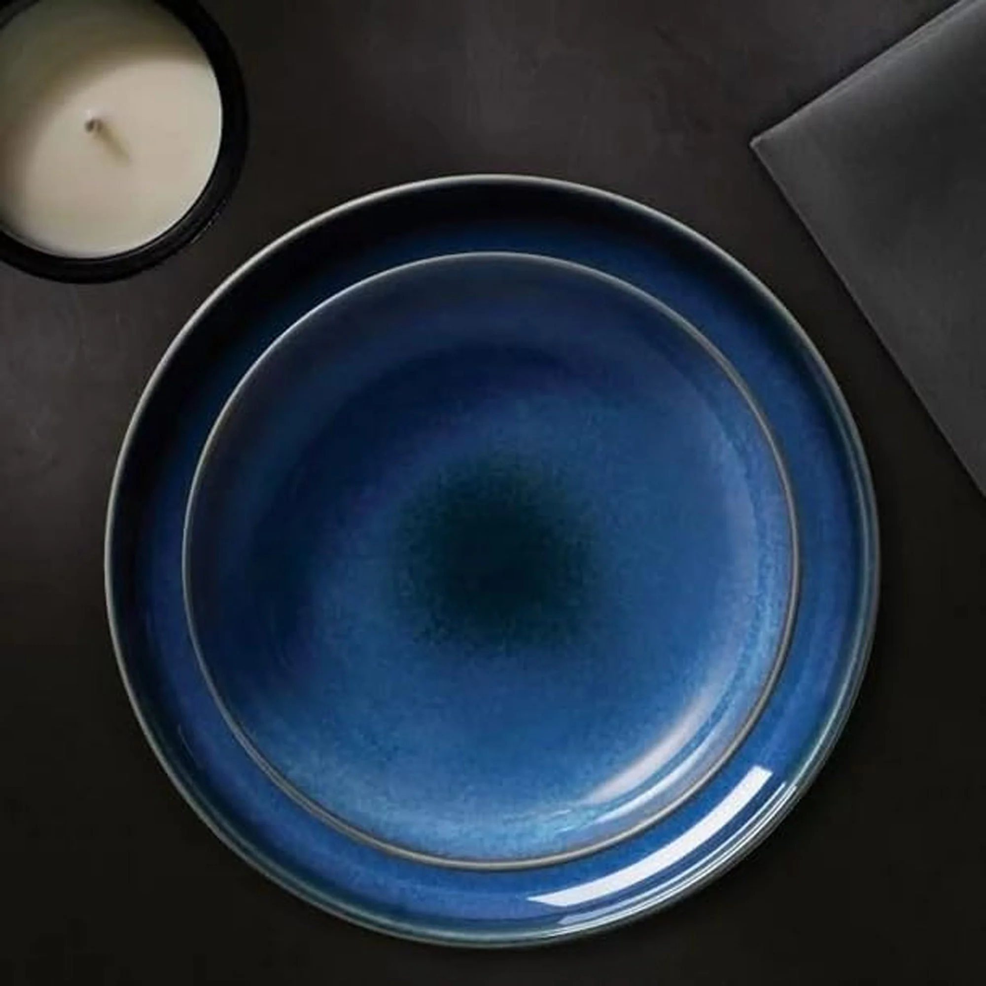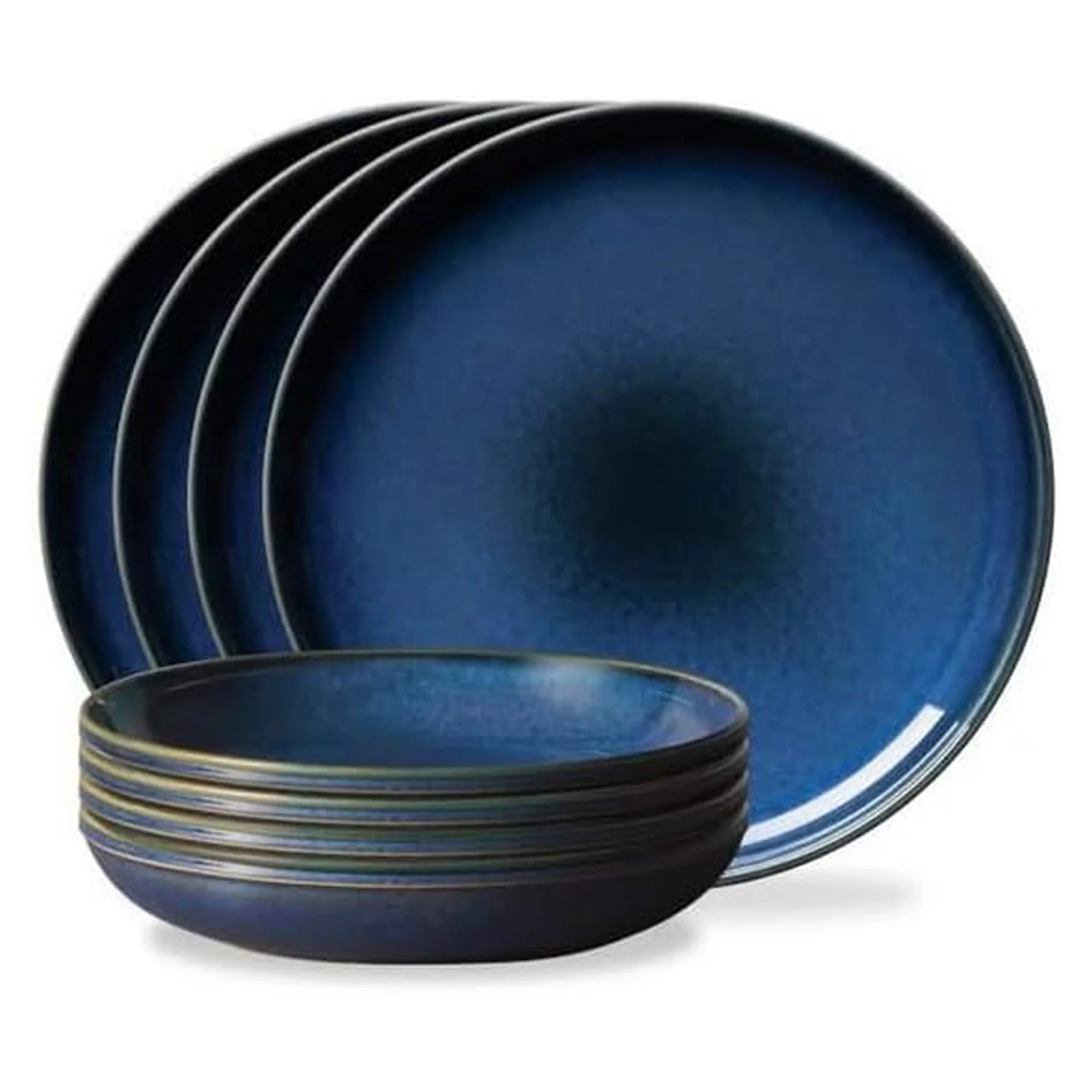Tired of boring beige dishes? Dive into a world of sophisticated style with the Corelle Stoneware 8-Piece Dinnerware Set in Navy! This handcrafted collection features a stunning, deep navy hue that adds a touch of drama to your table setting. Crafted from high-quality ceramic with unique double bead detailing, these dishes are as beautiful as they are durable.