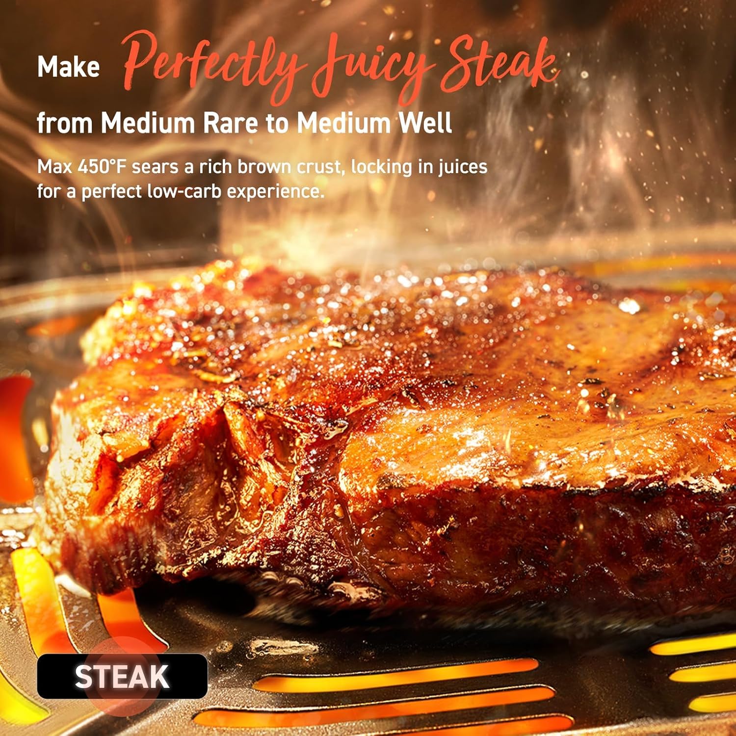 • 𝙑𝙚𝙧𝙨𝙖𝙩𝙞𝙡𝙚 𝙈𝙚𝙖𝙩 𝘾𝙤𝙤𝙠𝙞𝙣𝙜 𝙋𝙧𝙤𝙜𝙧𝙖𝙢𝙨 𝙛𝙤𝙧 𝙇𝙤𝙬-𝘾𝙖𝙧𝙗 𝘿𝙞𝙚𝙩𝙨: Featuring 9 cooking functions, including steak, chicken, seafood, bacon, and more, effortlessly prepare nutritious meals tailored to your dietary needs.