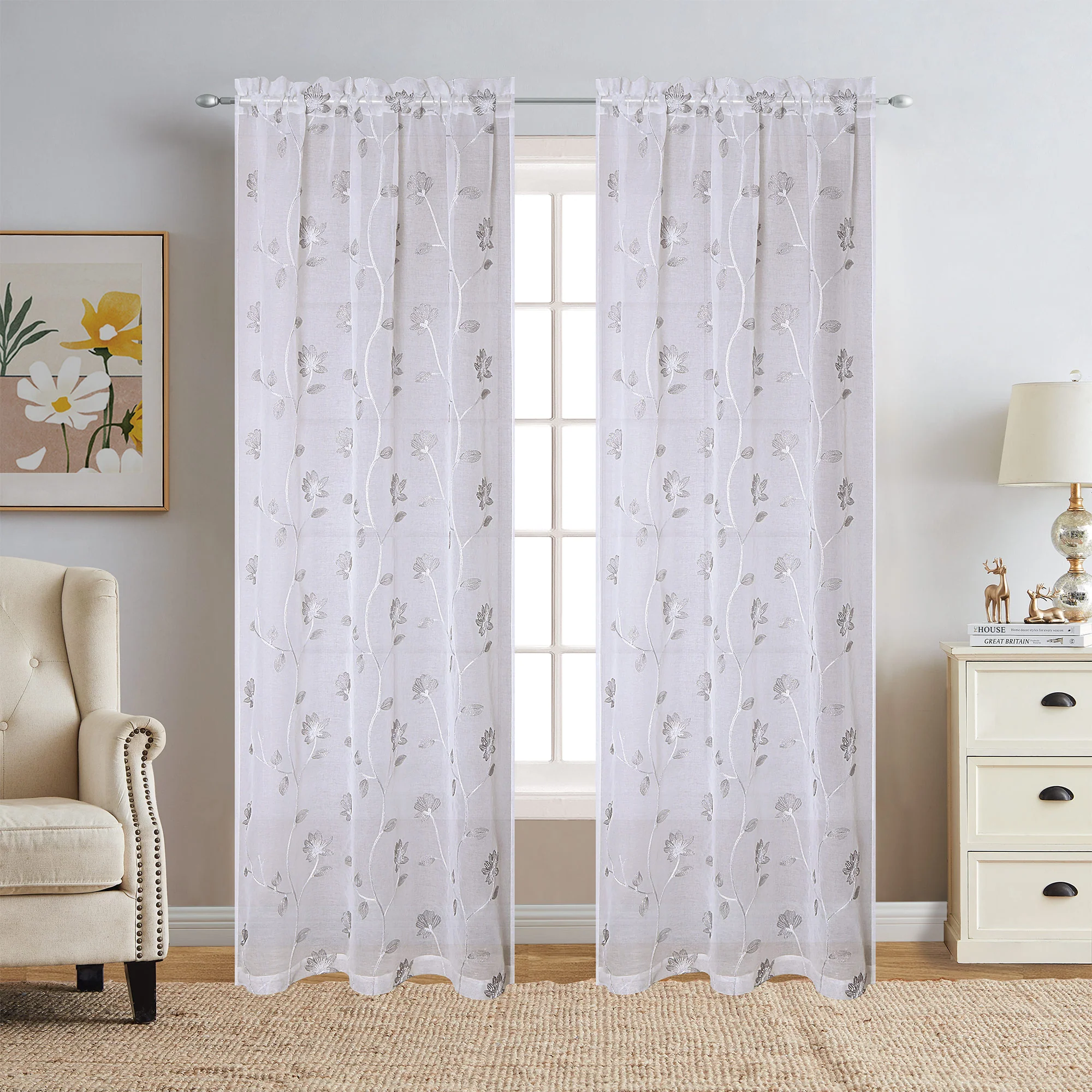 Bring the charm of spring indoors with Debra Sheer Floral Rod Pocket Window Panels. Sunlight dances through the airy sheer fabric, casting delicate floral embroidery in a warm glow. These panels add a touch of whimsical elegance to any room, from bedrooms to living areas.