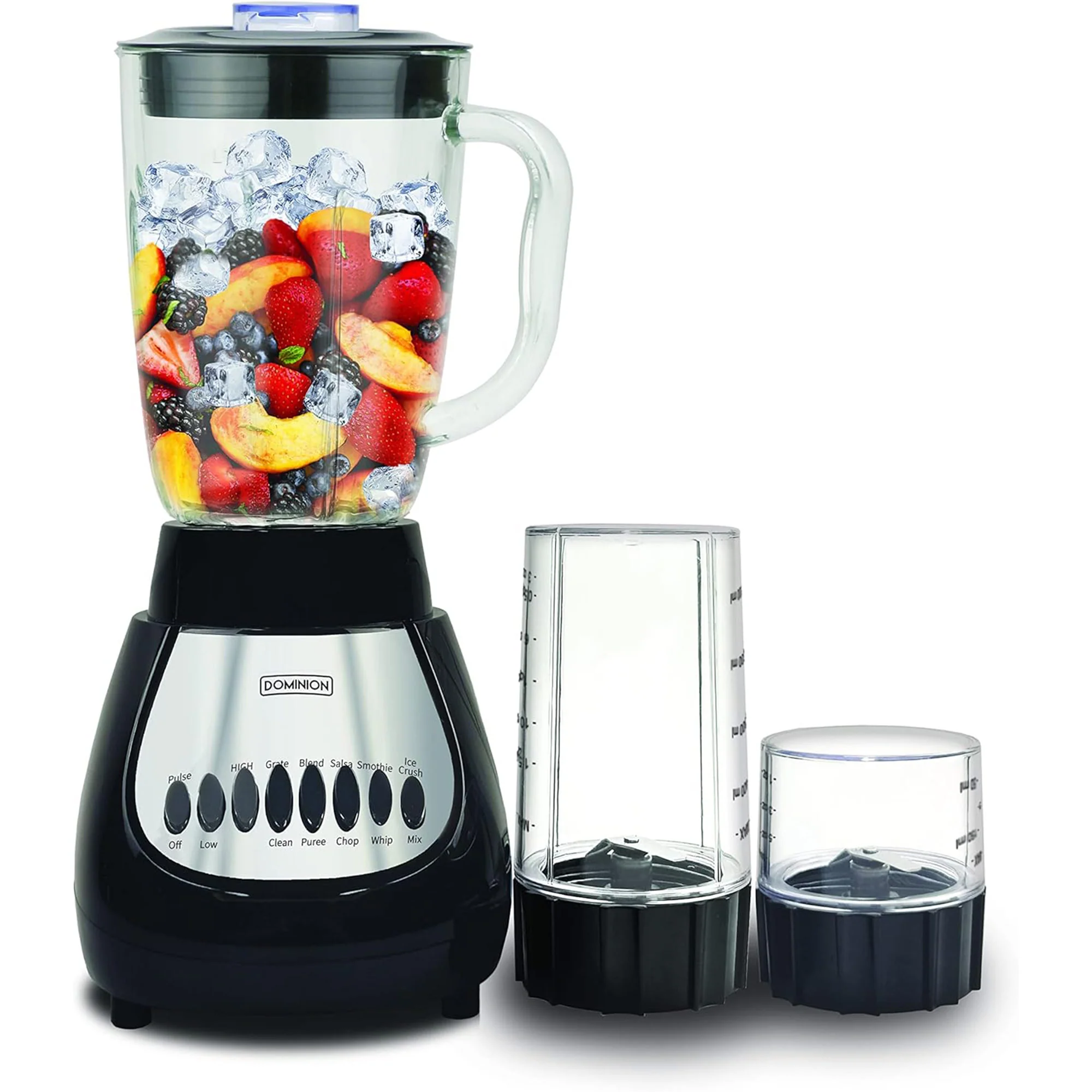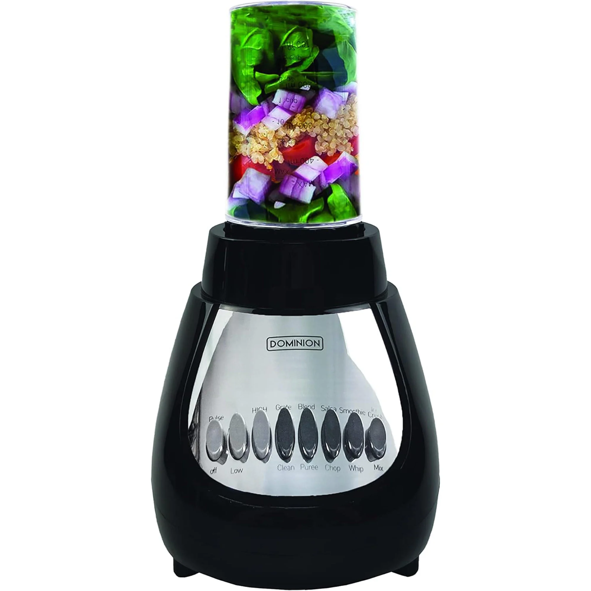 The Dominion BlendMax Blender, Chopper, and Grinder trio takes your blending options two steps further, letting you blend in the larger-capacity jar or convert to a convenient chopper or personal grinder. Whether you’re crushing ice for shakes and smoothies using the larger capacity jar, preparing vegetables, salsa, using the detachable chopper, or crushing nuts / coffee beans with the personal grinder, Dominion has you FULLY covered with three appliances in one. Its 600 peak watt motor starts with a boost of extra power, moving ingredients down into the blade to ensure smooth blending and multiple speeds provide plenty of options for just the right consistency. This unit is equipped with a multi-level blending blade allowing you to effortlessly crushes ice and works through ingredients with ease.