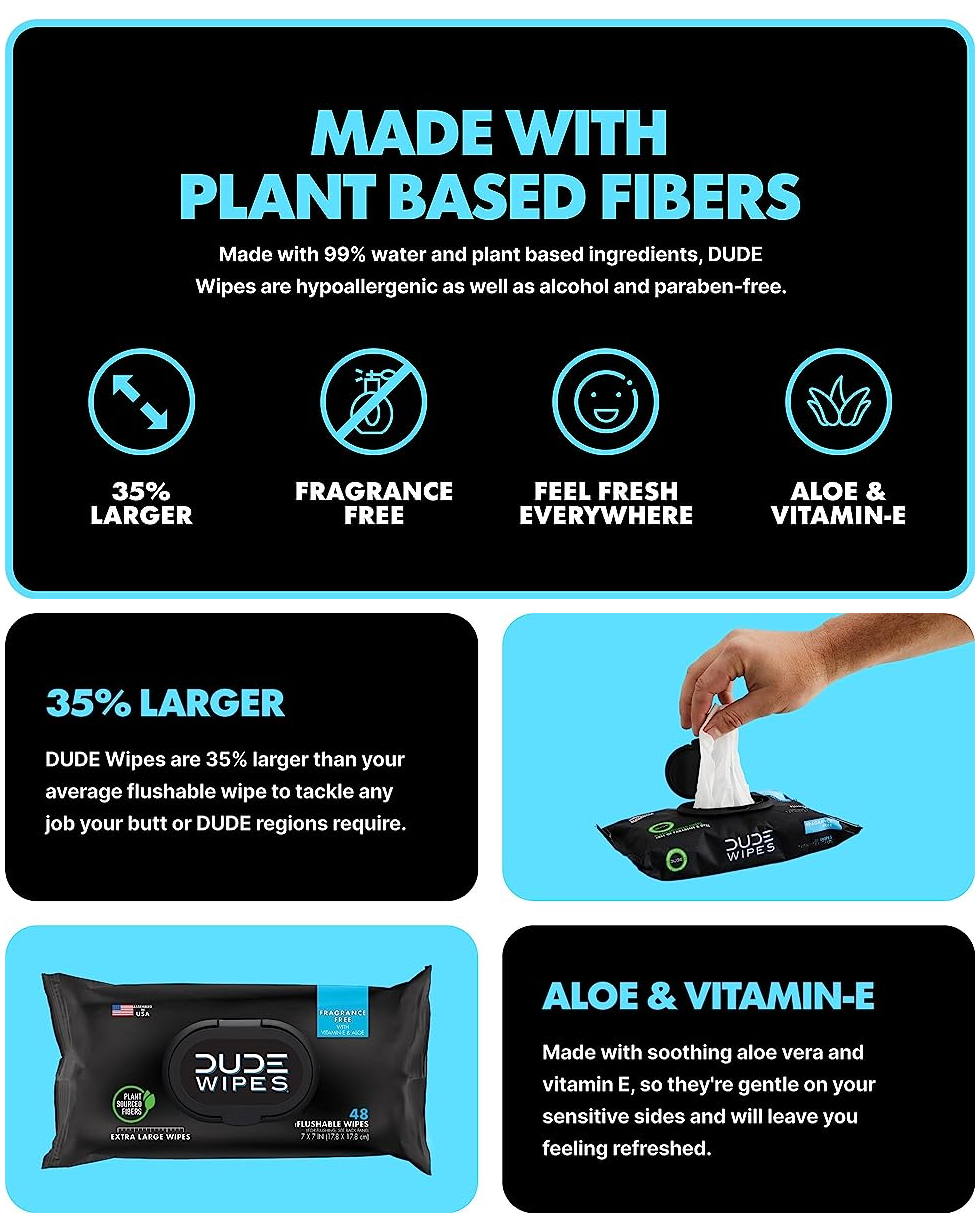 - FLUSHABLE & 100% PLANT SOURCED FIBERS: Our flushable wipes are made with plastic free and plant sourced fibers. Unlike baby wipes, DUDE Wipes are sewer and septic-safe and begin to break down when flushed. Say goodbye to toilet paper and say hello to DUDE flushable wet wipes for the whole family
