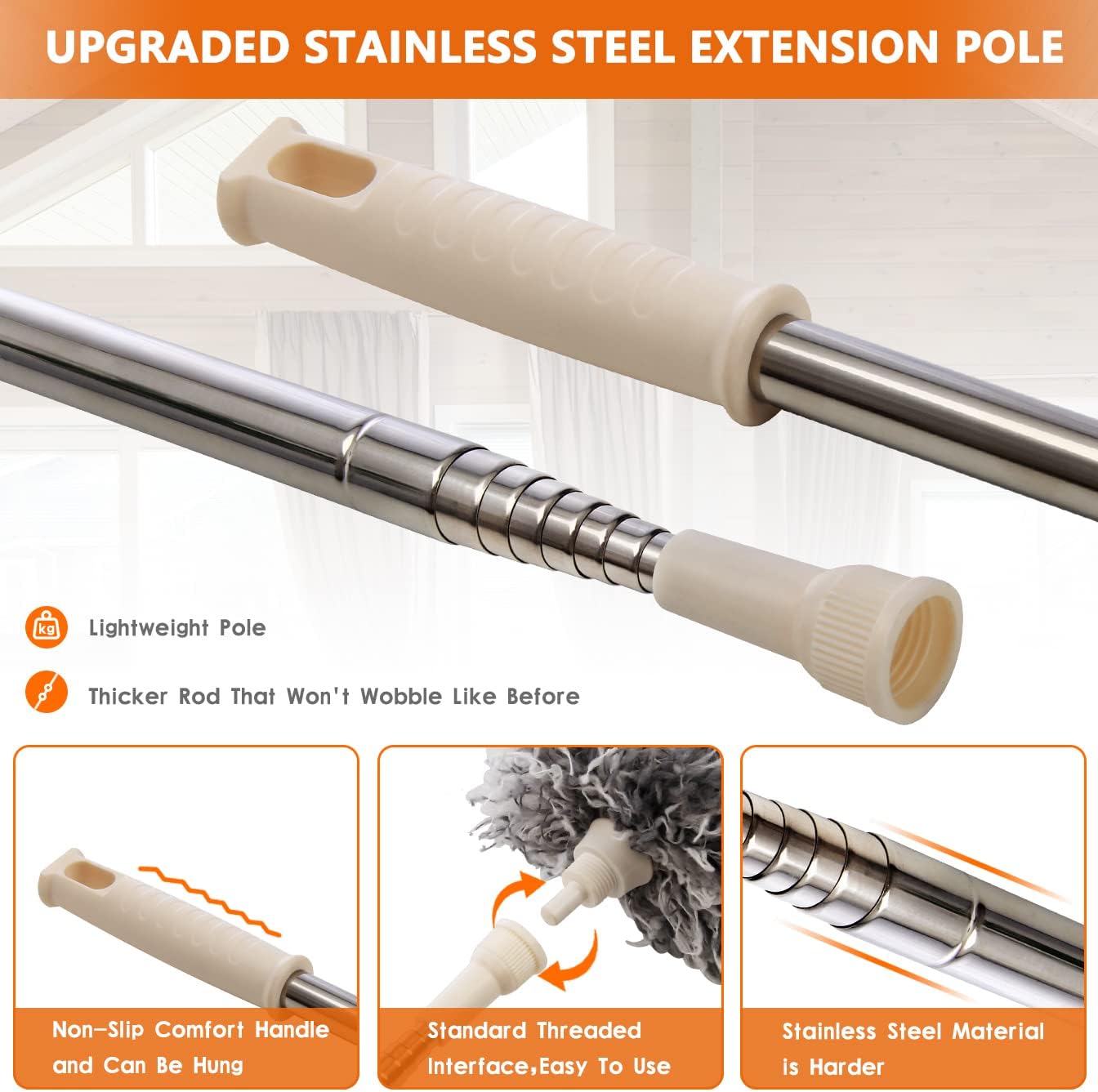 - 👍DUSTERS FOR CLEAN EFFECTIVELY - There won’t be trouble any more when you need to clean the high ceiling fan, our microfiber duster cleaner with new design stainless steel extension pole, does not rust, rotary thread reinforcement clamping, not easy to shake.