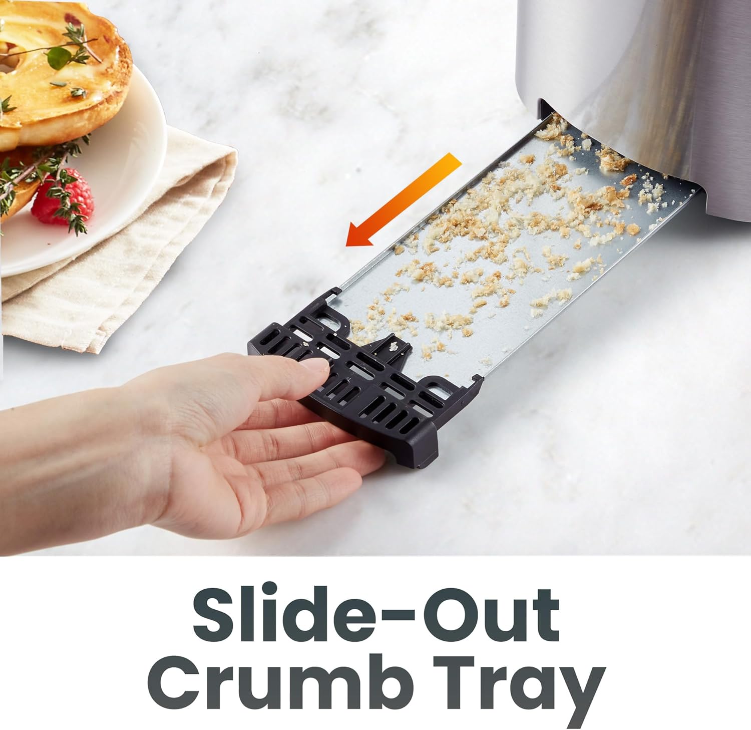 - DROP DOWN CRUMB TRAY & CORD STORAGE for quick and easy cleanup of crumbs and debris & no unsightly cords.