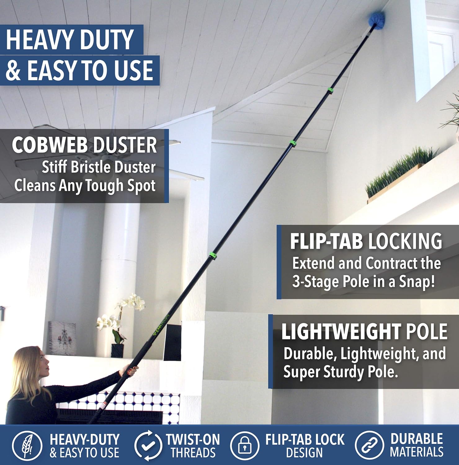 - SAY BYE BYE TO COBWEBS AND DUST–High-quality, lightweight, easy to use Cobweb Duster with Extension Pole. Built to last and with user experience in mind. Perfect for cleaning tall, hard to reach spots inside and outside: high ceilings, tight corners, walls, beams, and more!