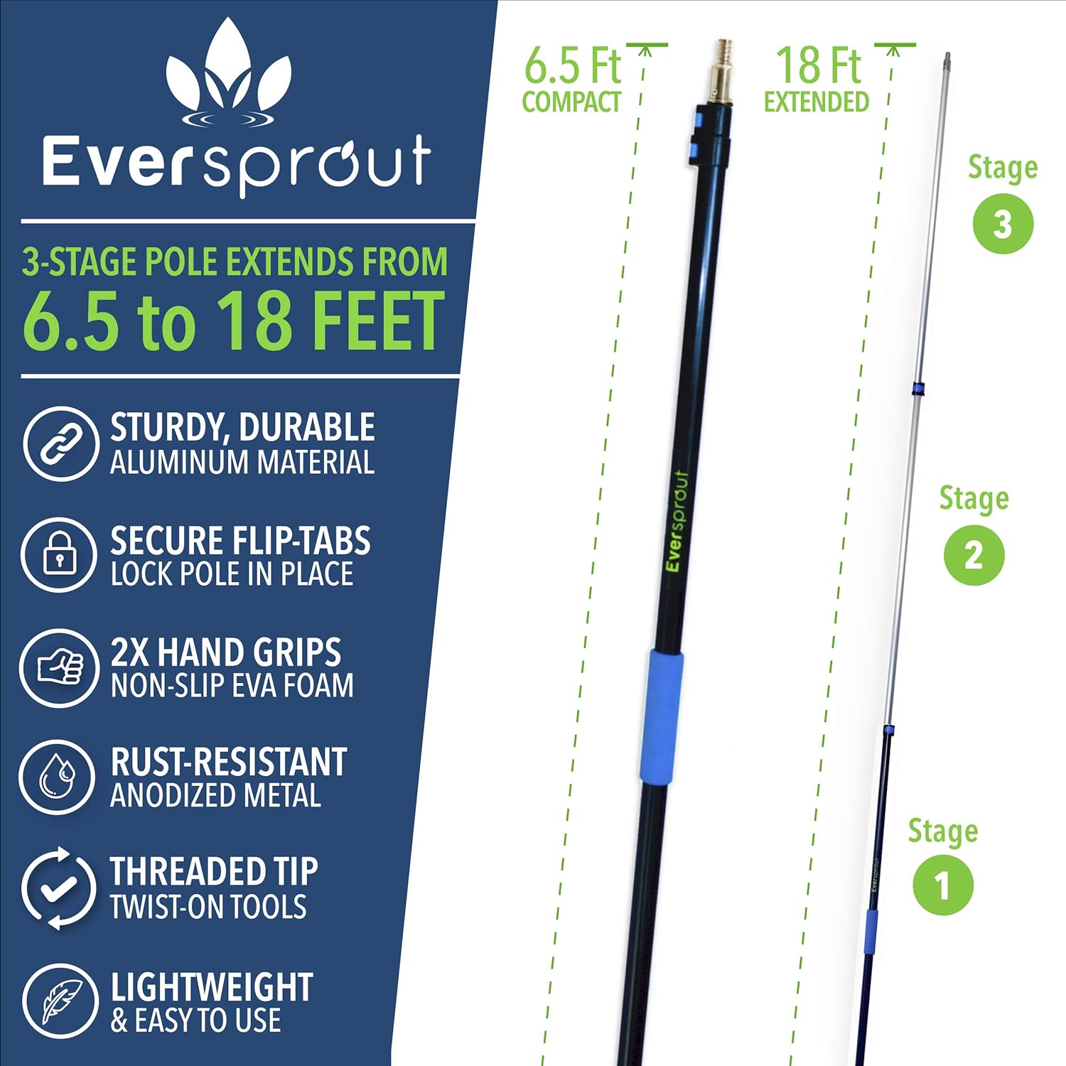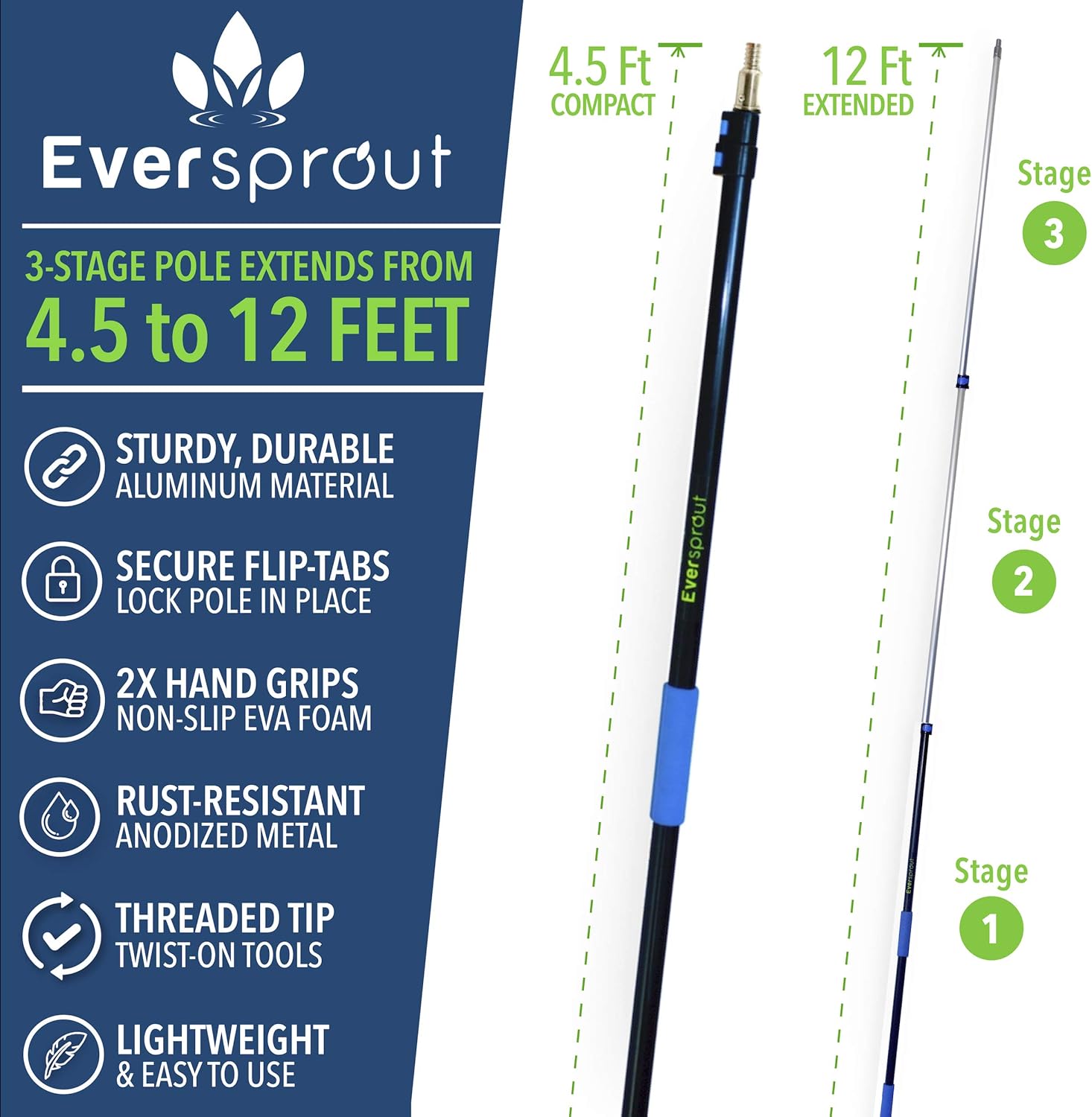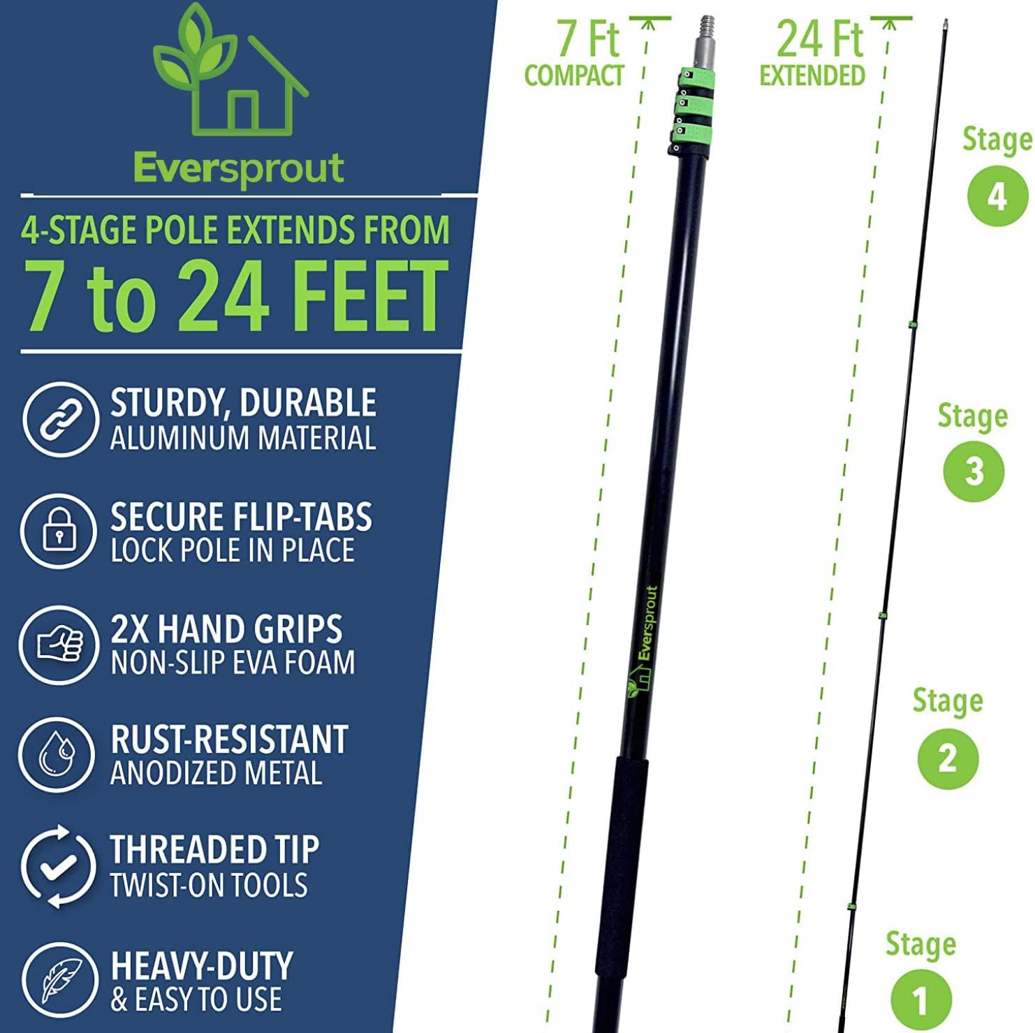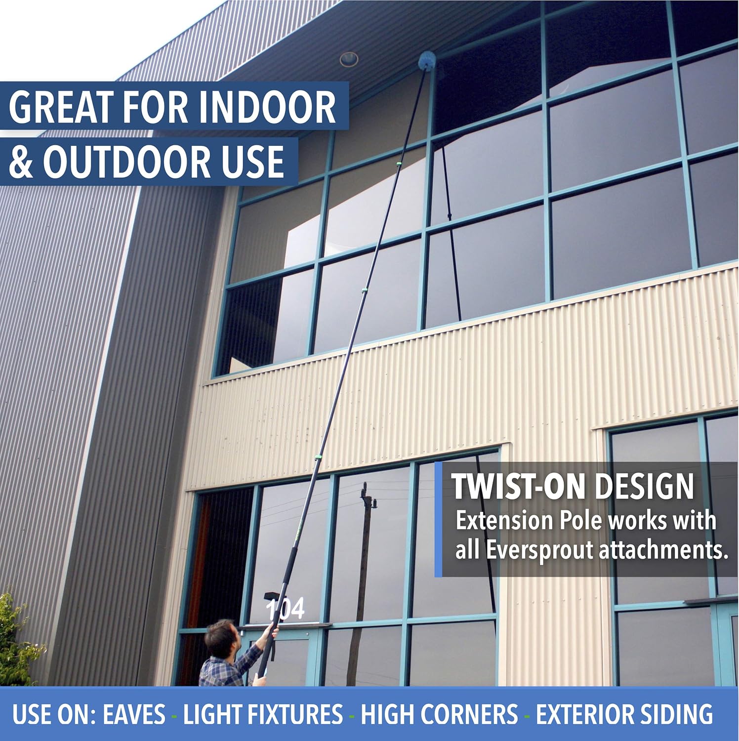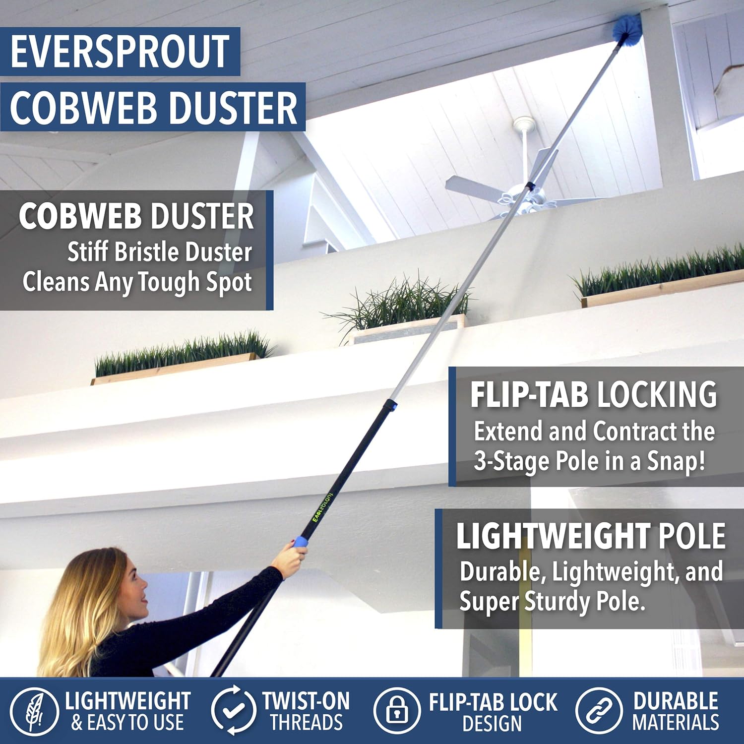 - SAVE TIME, SKIP THE LADDER – REACH UP TO 18-20 FEET WHEN STANDING – Included is Eversprout Extension Pole (4.5 to 12 ft) and Cobweb Duster (9” x 5” x 5”). with cobweb duster head and telescoping pole duster that had webster spider web remover