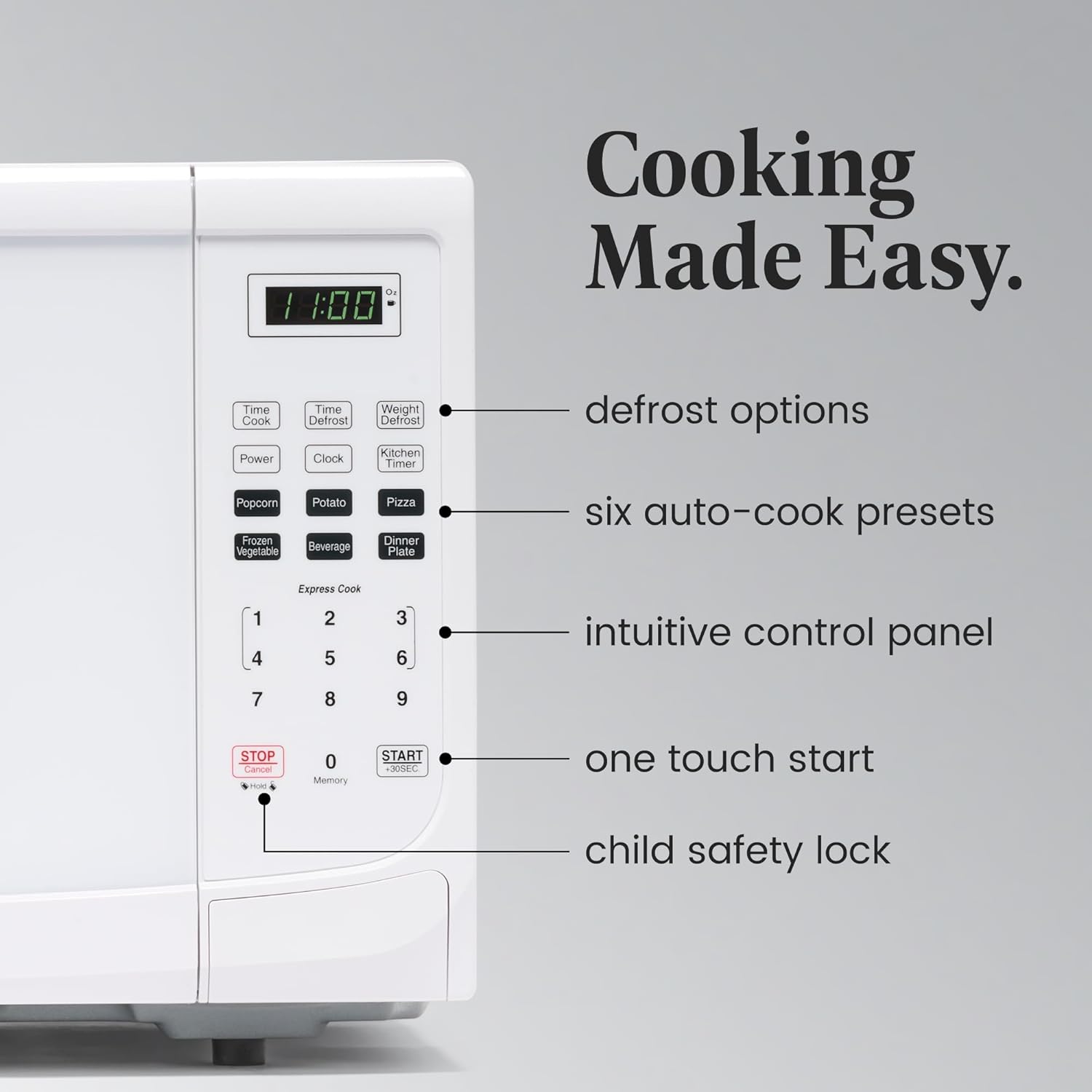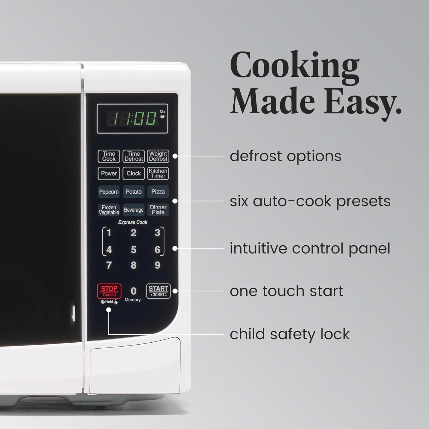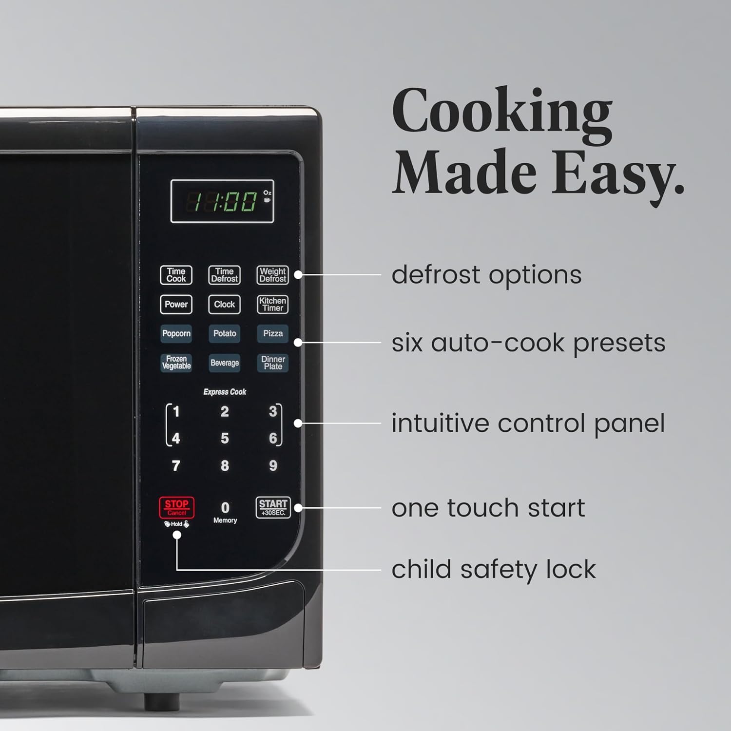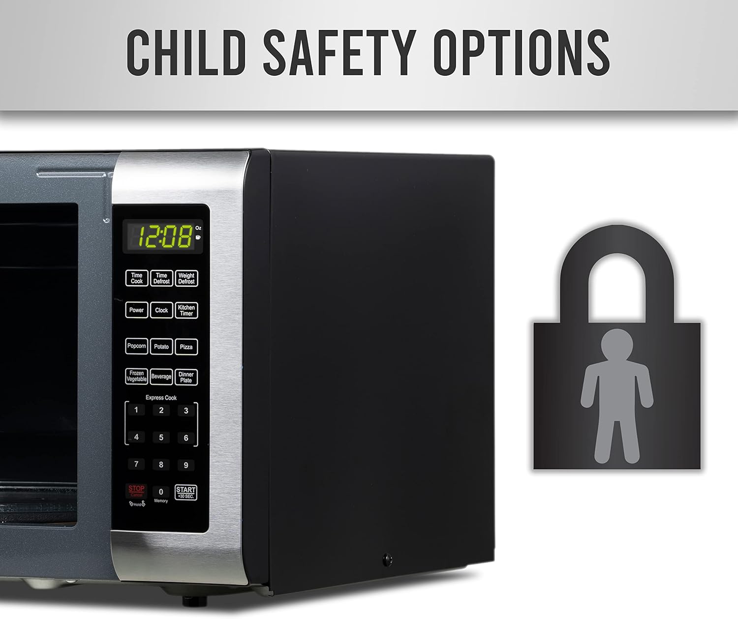 - ALL YOU NEED: This microwave has a clear LED display with a kitchen timer and clock that lets you easily keep track of time. Easy-to-view interior lighting lets you keep an eye on your dish, and a child safety lock adds additional security.
