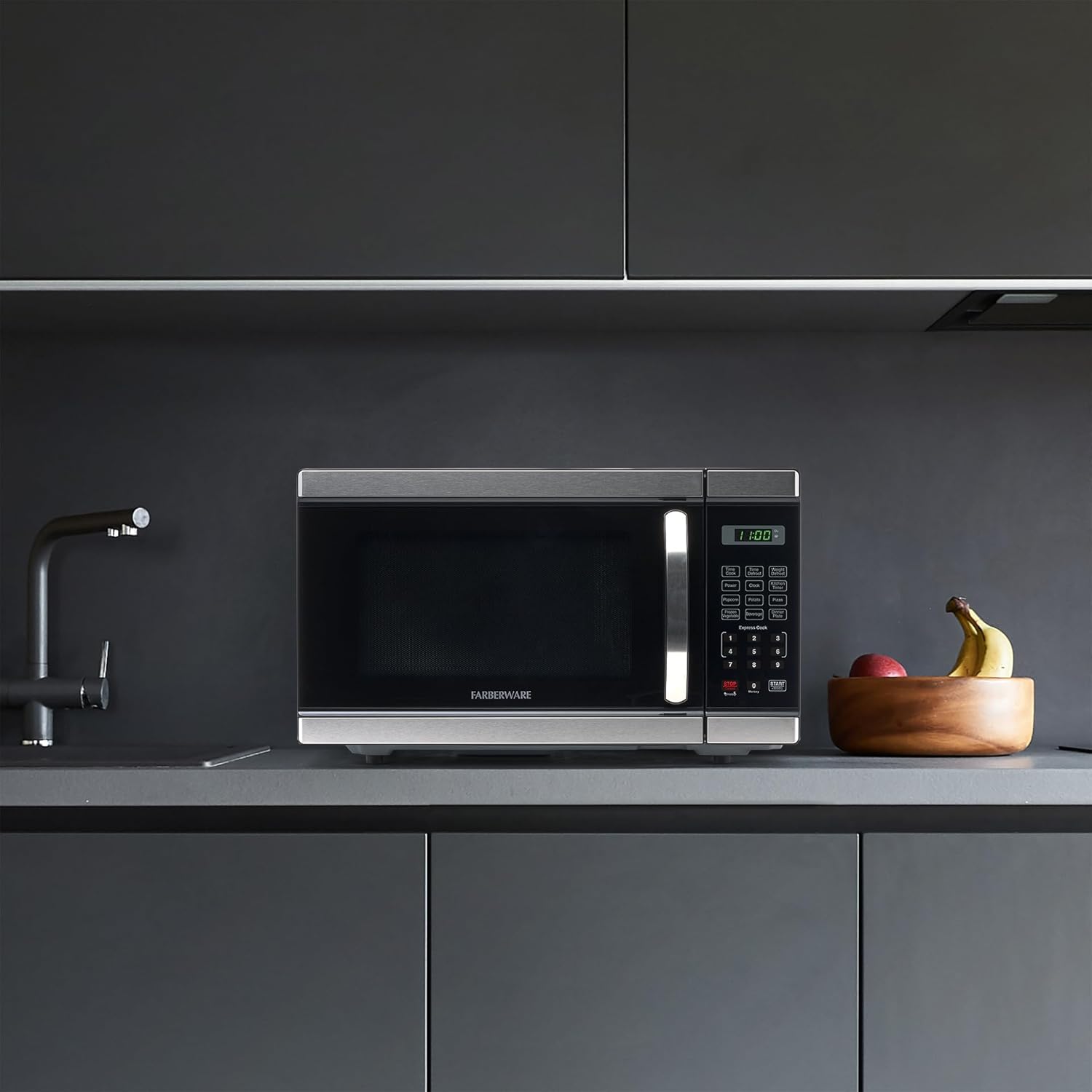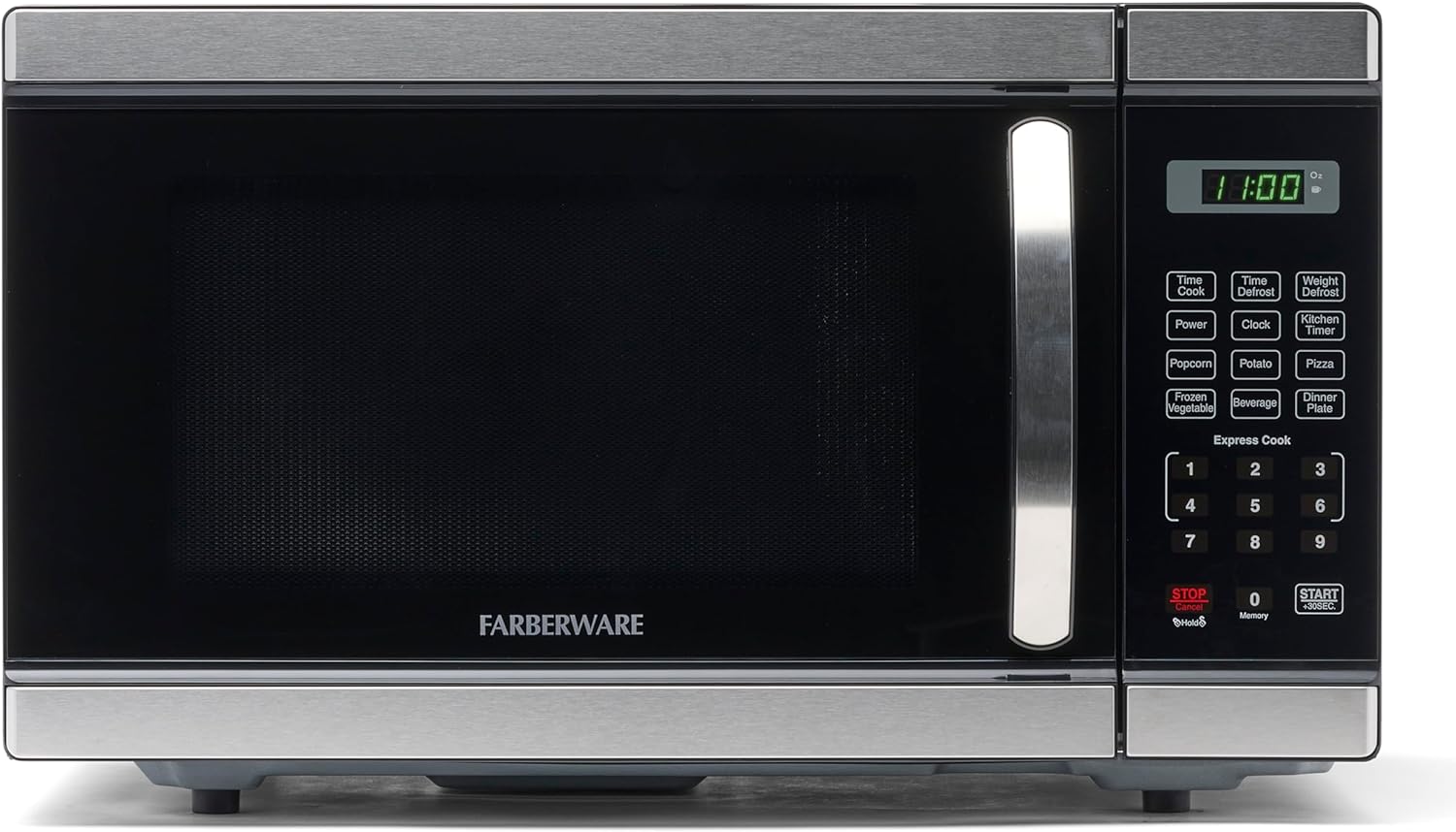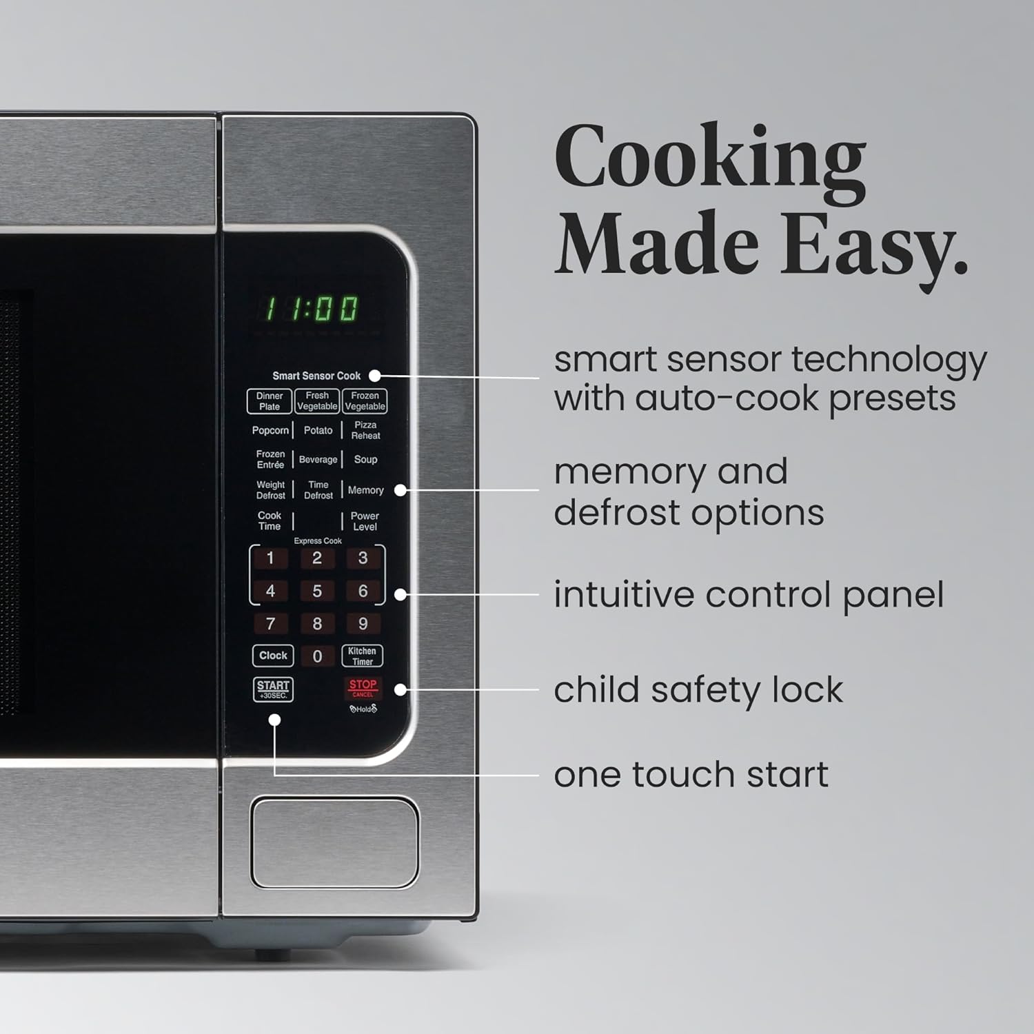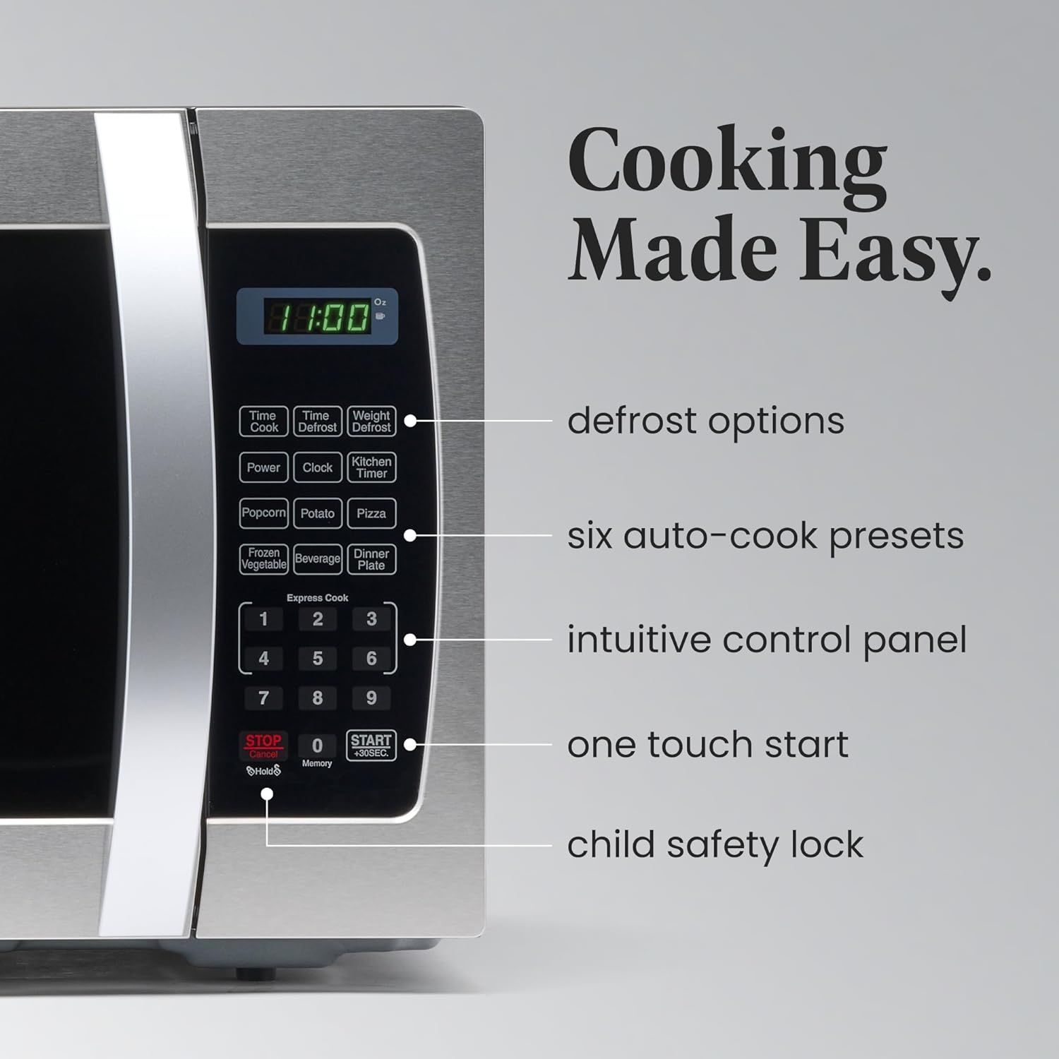 - ALL YOU NEED: This microwave has a clear LED display with a kitchen timer and clock that lets you easily keep track of time. Easy-to-view interior lighting lets you keep an eye on your dish, and a child safety lock adds additional security.