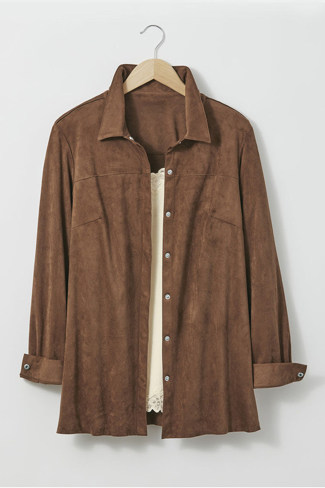 Luxurious to the touch with soft and supple stretch, and so easy to wear in a versatile, roomy silhouette. Detailed with raw-edge seams at the front and back yokes and atop the shoulders. Full hidden snap front.