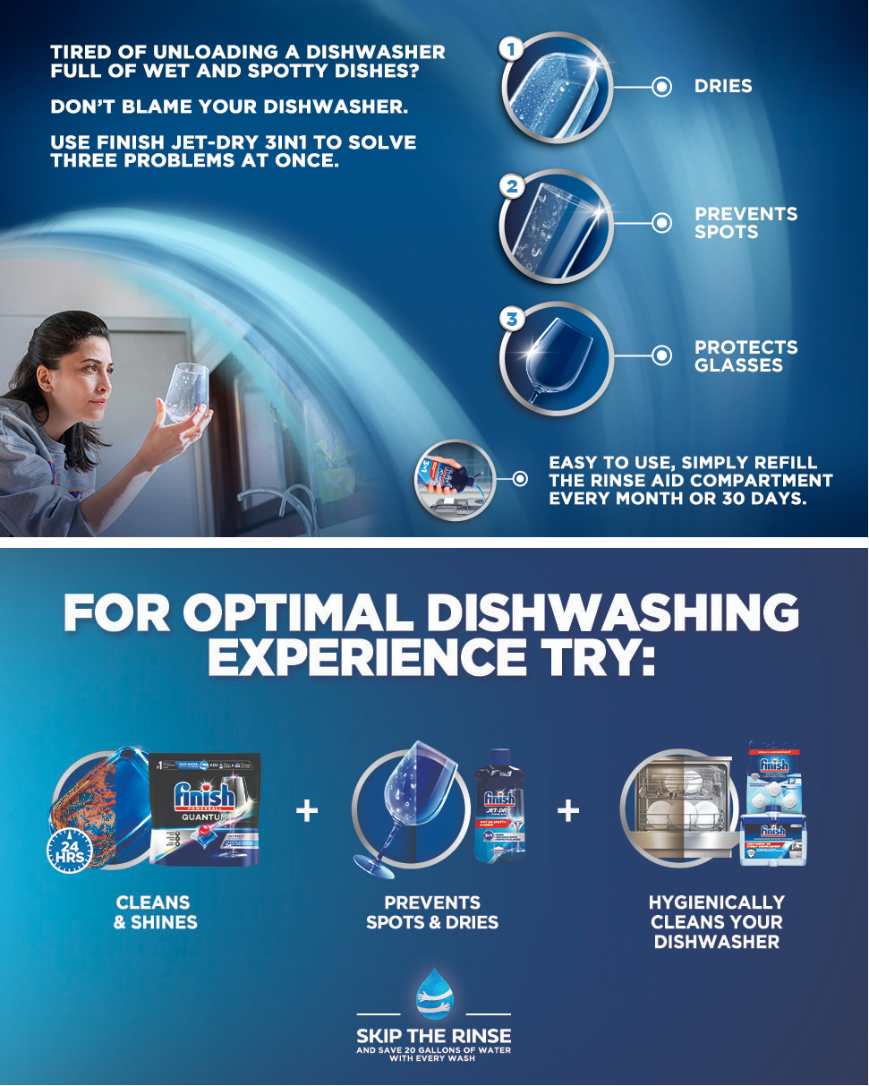 Simply fill your rinse aid dispenser with Finish Jet-Dry Rinse Aid and it will be automatically released in the rinse cycle every time your dishwasher runs.